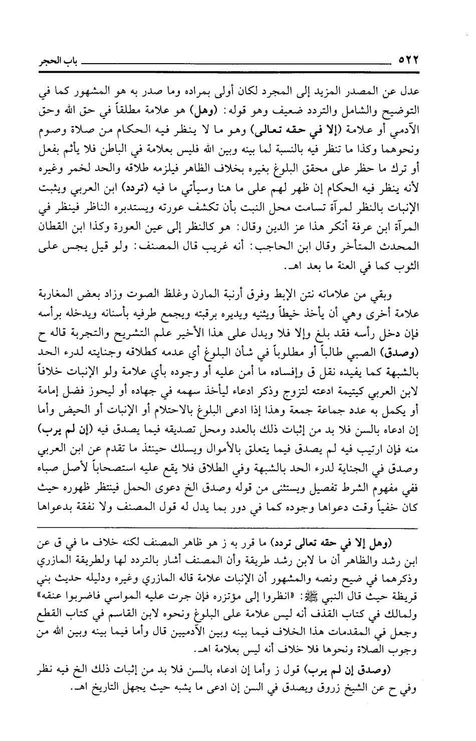 (وهل إلا في حقه تعالى تردد) ما قرر به ز هو ظاهر المصنف لكنه خلاف ما في ق عن ابن رشد والظاهر أن ما لابن رشد طريقة وأن المصنف أشار بالتردد لها ولطريقة المازري وذكرهما في ضيح ونصه والمشهور أن الإنبات علامة قاله المازري وغيره ودليله حديث بني قريظة حيث قال النبي - صلى الله عليه وسلم -: "انظروا إلى مؤتزره فإن جرت عليه المواسي فاضربوا عنقه" ولمالك في كتاب القذف أنه ليس علامة على البلوغ ونحوه لابن القاسم في كتاب القطع وجعل في المقدمات هذا الخلاف فيما بينه وبين الآدميين قال وأما فيما بينه وبين الله من وجوب الصلاة ونحوها فلا خلاف أنه ليس بعلامة اهـ.