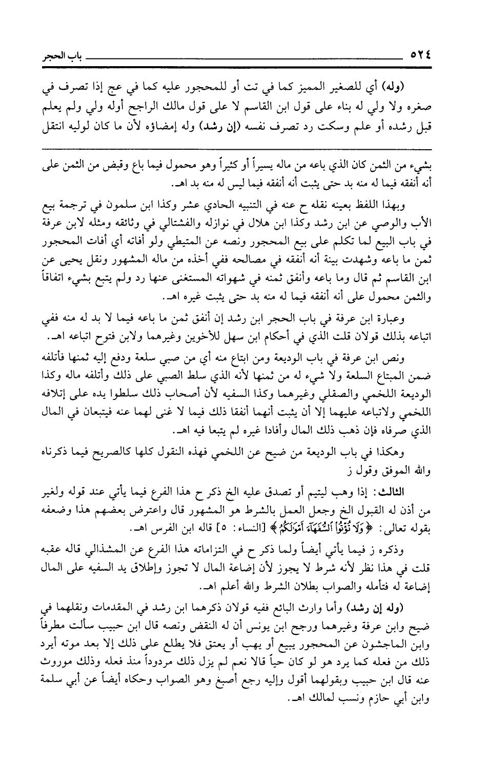 وعبارة ابن عرفة في باب الحجر ابن رشد إن أنفق ثمن ما باعه فيما لا بد له منه ففي اتباعه بذلك قولان قلت الذي في أحكام ابن سهل للأخوين وغيرهما ولابن فتوح اتباعه اهـ.