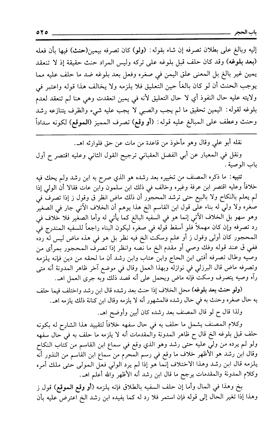 وكلام المصنف يشمل ما حلف به في حال سفهه خلافًا لتقييد هذا الشارح له بكونه حلف قبل بلوغه الخ قال ح ظاهر المدونة والمقدمات أنه لا يلزمه ما حلف به في حال سفهه ولو لم يرده من ولي عليه حتى رشد وهو الذي وقع في سماع ابن القاسم من كتاب النكاح وقال ابن رشد هو الأظهر خلاف ما وقع في رسم المحرم من سماع ابن القاسم من النذور أنه يلزمه قال ابن رشد وهذا الاختلاف إنما هو إذا لم يرد الولي فعل المولى حتى ملك أمره وكلام المدونة والمقدمات يرجح ما قال ابن رشد أنه الأظهر والله أعلم اهـ.