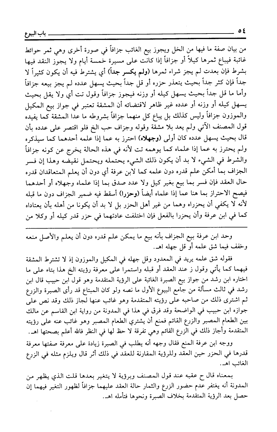 من بيان صفة ما فيها من الخل ويجوز بيع الغائب جزافًا في صورة أخرى وهي ثمر حوائط غائبة فيباع ثمرها كيلًا أو جزافًا إذا كانت على مسيرة خمسة أيام ولا يجوز النقد فيها بشرط فإن بعدت لم يجز شراء ثمرها (ولم يكسر جدًّا) أي يشترط فيه أن يكون كثيرًا لا جدًّا فإن كثر جدًّا بحيث يتعذر حزره أو قل جدًّا بحيث يسهل عدده لم يجز بيعه جزافًا وأما ما قل جدًّا بحيث يسهل كيله أو وزنه فيجوز جزافًا وقول تت أي ولا يقل بحيث يسهل كيله أو وزنه أو عدده غير ظاهر لاقتضائه أن المشقة تعتبر في جواز بيع المكيل والموزون جزافًا وليس كذلك بل يباع كل منهما جزافًا بشروطه ما عدا المشقة كما يفيده قول المصنف الآتي ولم يعد بلا مشقة وقوله وجزاف حب الخ فلو اقتصر على عدده بأن قال بحيث يسهل عدده كان أولى (وجهلاه) احترز به عما إذا علمه أحدهما كما سيذكره ولم يحترز به عما إذا علماه كما يوهمه تت لأنه في هذه الحالة يخرج عن كونه جزافًا والشرط في الشيء لا بد أن يكون ذلك الشيء يحتمله ويحتمل نقيضه وهذا إن فسر الجزاف بما أمكن علم قدره دون علمه كما لابن عرفة أي دون أن يعلم المتعاقدان قدره حال العقد فإن فسر بما بيع بغير كيل ولا عدد صدق بما إذا علماه وجهلاه أو أحدهما فيصح الاحتراز بما هنا عما إذا علماه أيضًا (وحزرا) أسقط فيه ضمير الجزاف دون ما قبله لأنه لا يكفي أن يحزراه وهما من غير أهل الحزر بل لا بد أن يكونا من أهله بأن يعتاداه كما في ابن عرفة وأن يحزراه بالفعل فإن اختلفت عادتهما في حزر قدر كيله أو وكلا من