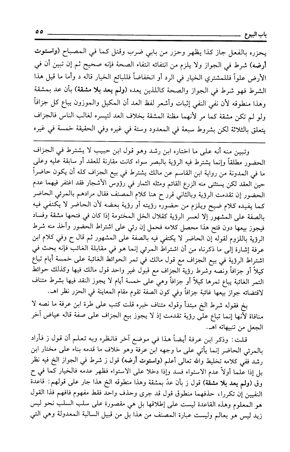 قلت: وذكر ابن عرفة أيضًا هذا في موضع آخر فانظره وبه تعلم أن قول ز فأراد بالمرئي الحاضر إنما يأتي على ما وجهه ابن عرفة وهو خلاف ما قدمه بناء على مختار ابن رشد ففي كلامه تخليط والله تعالى أعلم (واستوت أرضه) قول ز شرط في الجواز الخ فيه نظر بل إذا علما أولًا عدم الاستواء فسد وإذا دخلا على الاستواء فظهر عدمه فالخيار كما في ح وق (ولم يعد بلا مشقة) قول ز بأن عدّ بمشقة وهذا منطوقه الخ هذا جار على قولهم: قاعدة النفيين إن تكررا، حذفهما منطوق قول قد جرى وحذف واحد فقط مفهوم فافهم فذا القول هو المعلوم وهذه القاعدة ليست على إطلاقها بل هي مقصورة على سلب السلب نحو ليس زيد ليس هو بعالم وليست عبارة المصنف من هذا بل من قبيل السالبة المعدولة وهي التي