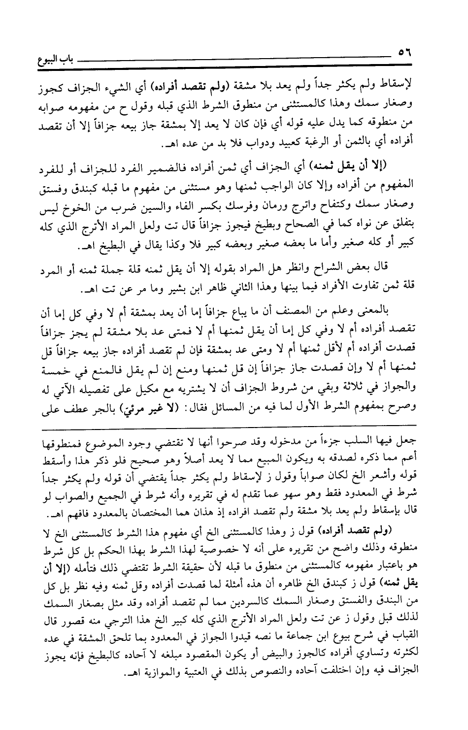 جعل فيها السلب جزءًا من مدخوله وقد صرحوا أنها لا تقتضي وجود الموضوع فمنطوقها أعم مما ذكره لصدقه به ويكون المبيع مما لا يعد أصلًا وهو صحيح فلو ذكر هذا وأسقط قوله وأشعر الخ لكان صوابًا وقول ز لإسقاط ولم يكثر جدًّا يقتضي أن قوله ولم يكثر جدًّا شرط في المعدود فقط وهو سهو عما تقدم له في تقريره وأنه شرط في الجميع والصواب لو قال بإسقاط ولم يعد بلا مشقة ولم تقصد أفراده إذ هذان هما المختصان بالمعدود فافهم اهـ.