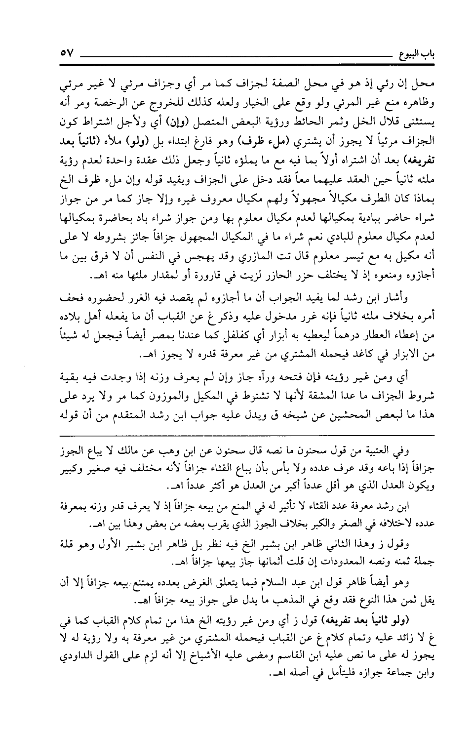 وفي العتبية من قول سحنون ما نصه قال سحنون عن ابن وهب عن مالك لا يباع الجوز جزافًا إذا باعه وقد عرف عدده ولا بأس بأن يباع القثاء جزافًا لأنه مختلف فيه صغير وكبير ويكون العدل الذي هو أقل عددًا أكبر من العدل هو أكثر عددًا اهـ.