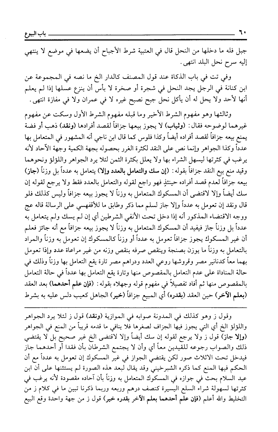وثالثها وهو مفهوم الشرط الأخير وما قبله مفهوم الشرط الأول وسكت عن مفهوم غيرهما لوضوحه فقال: (وثياب) لا يجوز بيعها جزافًا لقصد أفرادها (ونقد) ذهب أو فضة يمنع بيعه جزافًا لقصد أفراده أيضًا وكذا فلوس كما قال ابن ناجي أنه المشهور في المتعامل بها عددًا وكذا الجواهر وإنما نص على النقد لكثرة الغرر بحصوله بجهة الكمية وجهة الآحاد لأنه يرغب في كثرتها ليسهل الشراء بها ولا يعلل بكثرة الثمن لئلا يرد الجواهر واللؤلؤ ونحوهما وقيد منع بيع النقد جزافًا بقوله: (إن سك والتعامل بالعدد وإلا) يتعامل به عددًا بل وزنًا (جاز) بيعه جزافًا لعدم قصد أفراده حينئذٍ فهو راجع لقوله والتعامل بالعدد فقط ولا يرجع لقوله إن سك أيضًا وإلا لاقتضى أن المسكوك المتعامل به وزنًا لا يجوز بيعه جزافًا وليس كذلك فلو قال ونقد إن تعومل به عددًا وإلا جاز لسلم مما ذكر وطابق ما للأقفهسي على الرسالة قاله عج ووجه الاقتضاء المذكور أنه إذا دخل تحت الأنفي الشرطين أي إن لم يسك ولم يتعامل به عددًا بل وزنًا جاز فيفيد أن المسكوك المتعامل به وزنًا لا يجوز بيعه جزافًا مع أنه جائز فعلم أن غير المسكوك يجوز جزافًا تعومل به عددًا أو وزنًا كالمسكوك إن تعومل به وزنًا والمراد بالتعامل به وزنًا ما يوزن بصنجة وينقص صرفه بنقص وزنه من غير مراعاة عدد وإذا تعومل بهما معًا كدنانير مصر وقروشها روعي العدد ودراهم مصر تارة يقع التعامل بها وزنًا وذلك في حالة المناداة على عدم التعامل بالمقصوص منها وتارة يقع التعامل بها عددًا في حالة التعامل بالمقصوص منها ثم أفاد تفصيلًا في مفهوم قوله وجهلاه بقوله: (فإن علم أحدهما) بعد العقد (بعلم الآخر) حين العقد (بقدره) أي المبيع جزافًا (خير) الجاهل كعيب دلس عليه به بشرط