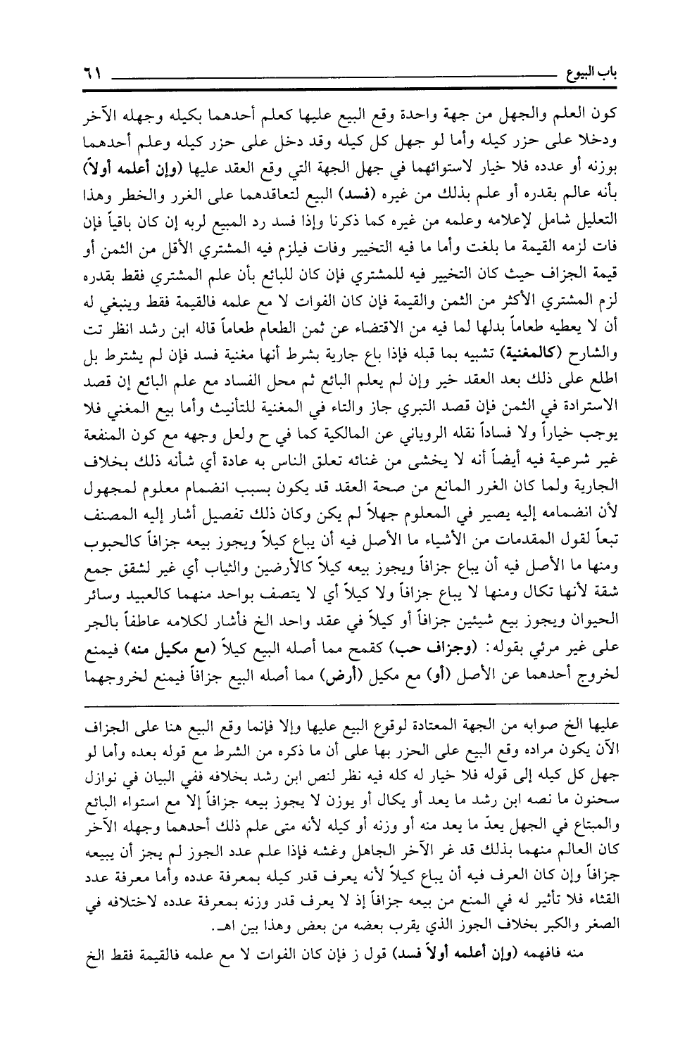 عليها الخ صوابه من الجهة المعتادة لوقوع البيع عليها وإلا فإنما وقع البيع هنا على الجزاف الآن يكون مراده وقع البيع على الحزر بها على أن ما ذكره من الشرط مع قوله بعده وأما لو جهل كل كيله إلى قوله فلا خيار له كله فيه نظر لنص ابن رشد بخلافه ففي البيان في نوازل سحنون ما نصه ابن رشد ما يعد أو يكال أو يوزن لا يجوز بيعه جزافًا إلا مع استواء البائع والمبتاع في الجهل يعدّ ما يعد منه أو وزنه أو كيله لأنه متى علم ذلك أحدهما وجهله الآخر كان العالم منهما بذلك قد غر الآخر الجاهل وغشه فإذا علم عدد الجوز لم يجز أن يبيعه جزافًا وإن كان العرف فيه أن يباع كيلًا لأنه يعرف قدر كيله بمعرفة عدده وأما معرفة عدد القثاء فلا تأثير له في المنع من بيعه جزافًا إذ لا يعرف قدر وزنه بمعرفة عدده لاختلافه في الصغر والكبر بخلاف الجوز الذي يقرب بعضه من بعض وهذا بين اهـ.