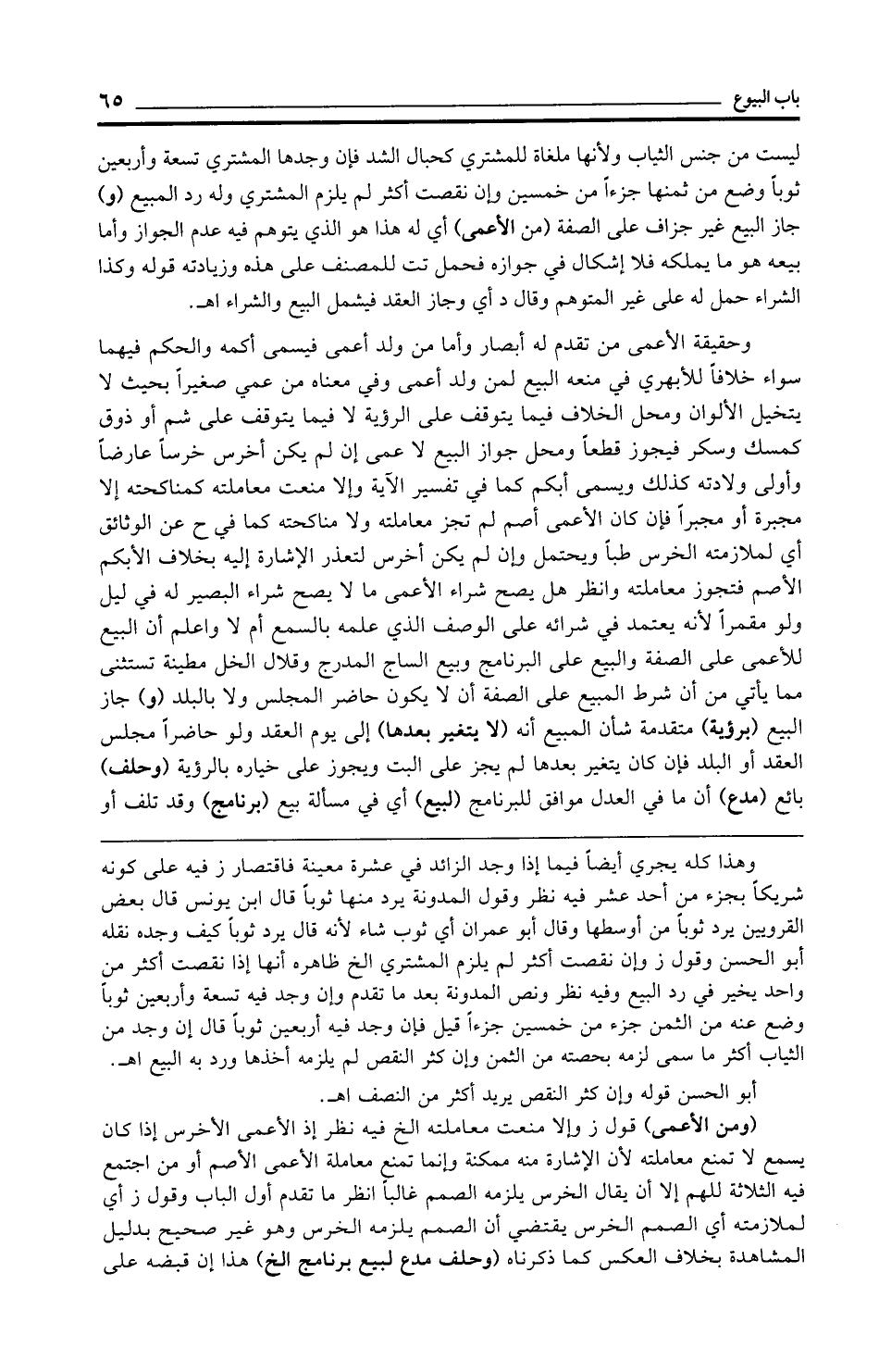 وحقيقة الأعمى من تقدم له أبصار وأما من ولد أعمى فيسمى أكمه والحكم فيهما سواء خلافًا للأبهري في منعه البيع لمن ولد أعمى وفي معناه من عمي صغيرًا بحيث لا يتخيل الألوان ومحل الخلاف فيما يتوقف على الرؤية لا فيما يتوقف على شم أو ذوق كمسك وسكر فيجوز قطعًا ومحل جواز البيع لا عمى إن لم يكن أخرس خرسًا عارضًا وأولى ولادته كذلك ويسمى أبكم كما في تفسير الآية وإلا منعت معاملته كمناكحته إلا مجبرة أو مجبرًا فإن كان الأعمى أصم لم تجز معاملته ولا مناكحته كما في ح عن الوثائق أي لملازمته الخرس طبًّا ويحتمل وإن لم يكن أخرس لتعذر الإشارة إليه بخلاف الأبكم الاسم فتجوز معاملته وانظر هل يصح شراء الأعمى ما لا يصح شراء البصير له في ليل ولو مقمرًا لأنه يعتمد في شرائه على الوصف الذي علمه بالسمع أم لا واعلم أن البيع للأعمى على الصفة والبيع على البرنامج وبيع الساج المدرج وقلال الخل مطينة تستثنى مما يأتي من أن شرط المبيع على الصفة أن لا يكون حاضر المجلس ولا بالبلد (و) جاز البيع (برؤية) متقدمة شأن المبيع أنه (لا يتغير بعدها) إلى يوم العقد ولو حاضرًا مجلس العقد أو البلد فإن كان يتغير بعدها لم يجز على البت ويجوز على خياره بالرؤية (وحلف) بائع (مدع) أن ما في العدل موافق للبرنامج (لبيع) أي في مسألة بيع (برنامج) وقد تلف أو