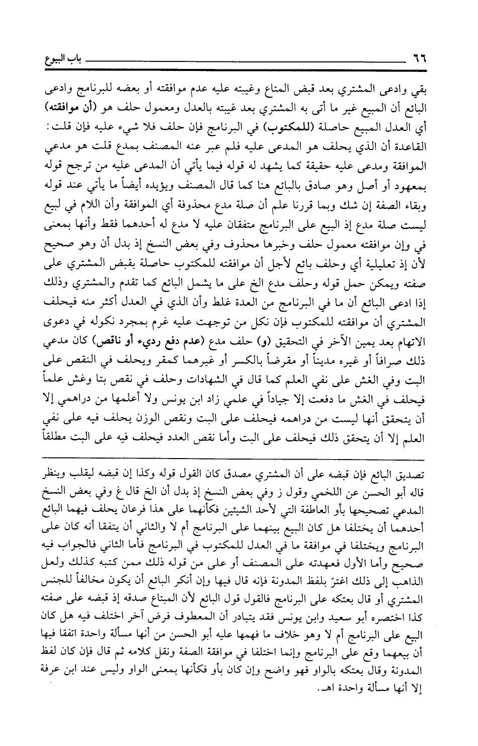 بقي وادعى المشتري بعد قبض المتاع وغيبته عليه عدم موافقته أو بعضه للبرنامج وادعى البائع أن المبيع غير ما أتى به المشتري بعد غيبته بالعدل ومعمول حلف هو (أن موافقته) أي العدل المبيع حاصلة (للمكتوب) في البرنامج فإن حلف فلا شيء عليه فإن قلت: القاعدة أن الذي يحلف هو المدعى عليه فلم عبر عنه المصنف بمدع قلت هو مدعي الموافقة ومدعى عليه حقيقة كما يشهد له قوله فيما يأتي أن المدعى عليه من ترجح قوله بمعهود أو أصل وهو صادق بالبائع هنا كما قال المصنف ويؤيده أيضًا ما يأتي عند قوله وبقاء الصفة إن شك وبما قررنا علم أن صلة مدع محذوفة أي الموافقة وأن اللام في لبيع ليست صلة مدع إذ البيع على البرنامج متففان عليه لا مدع له أحدهما فقط وأنها بمعنى في وإن موافقته معمول حلف وخبرها محذوف وفي بعض النسخ إذ بدل أن وهو صحيح لأن إذ تعليلية أي وحلف بائع لأجل أن موافقته للمكتوب حاصلة بقبض المشتري على صفته ويمكن حمل قوله وحلف مدع الخ على ما يشمل البائع كما تقدم والمشتري وذلك إذا ادعى البائع أن ما في البرنامج من العدة غلط وأن الذي في العدل أكثر منه فيحلف المشتري أن موافقته للمكتوب فإن نكل من توجهت عليه غرم بمجرد نكوله في دعوى الاتهام بعد يمين الآخر في التحقيق (و) حلف مدع (عدم دفع رديء أو ناقص) كان مدعي ذلك صرافًا أو غيره مدينًا أو مقرضًا بالكسر أو غيرهما كمقر ويحلف في النقص على البت وفي الغش على نفي العلم كما قال في الشهادات وحلف في نقص بتا وغش علمًا فيحلف في الغش ما دفعت إلا جيادًا في علمي زاد ابن يونس ولا أعلمها من دراهمي إلا أن يتحقق أنها ليست من دراهمه فيحلف على البت ونقص الوزن يحلف فيه على نفي العلم إلا أن يتحقق ذلك فيحلف على البت وأما نقص العدد فيحلف فيه على البت مطلقًا