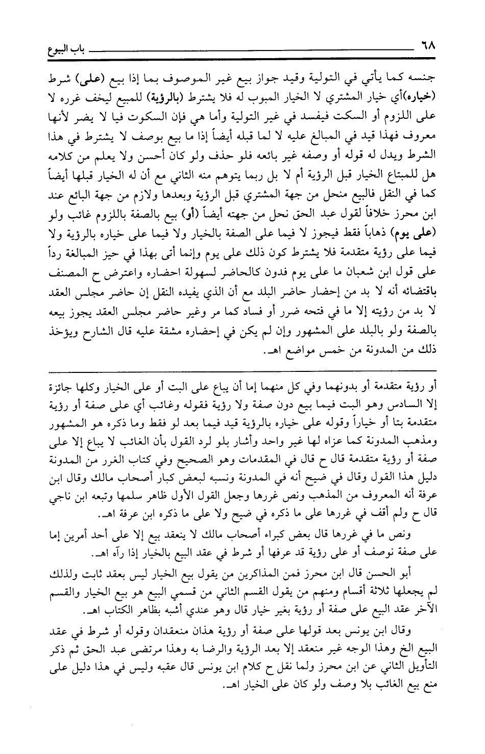 أبو الحسن قال ابن محرز فمن المذاكرين من يقول بيع الخيار ليس بعقد ثابت ولذلك لم يجعلها ثلاثة أقسام ومنهم من يقول القسم الثاني من قسمي البيع هو بيع الخيار والقسم الآخر عقد البيع على صفة أو رؤية بغير خيار قال وهو عندي أشبه بظاهر الكتاب اهـ.