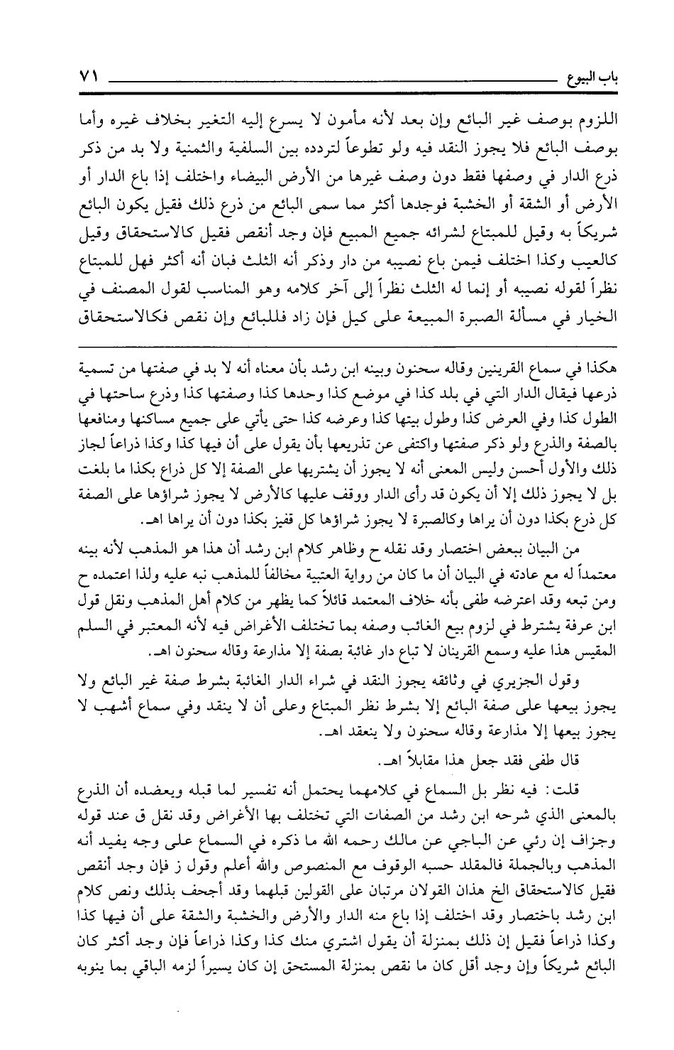 من البيان ببعض اختصار وقد نقله ح وظاهر كلام ابن رشد أن هذا هو المذهب لأنه بينه معتمدًا له مع عادته في البيان أن ما كان من رواية العتبية مخالفًا للمذهب نبه عليه ولذا اعتمده ح ومن تبعه وقد اعترضه طفى بأنه خلاف المعتمد قائلًا كما يظهر من كلام أهل المذهب ونقل قول ابن عرفة يشترط في لزوم بيع الغائب وصفه بما تختلف الأغراض فيه لأنه المعتبر في السلم المقيس هذا عليه وسمع القرينان لا تباع دار غائبة بصفة إلا مذارعة وقاله سحنون اهـ.