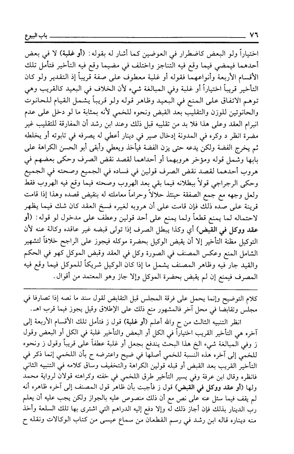 اختيارًا ولو البعض كاضطرار في العوضين كما أشار له بقوله: (أو غلبة) لا في بعض أحدهما فيمضي فيما وقع فيه التناجز واختلف في مضي ما وقع فيه التأخير فتأمل تلك الأقسام الأربعة وأنواعهما فقوله أو غلبة معطوف على صفة قريبًا إذ التقدير ولو كان التأخير قريبًا اختيارًا أو غلبة وفي المبالغة شيء لأن الخلاف في البعيد كالقريب وهي توهم الاتفاق على المنع في البعيد وظاهر قوله ولو قريبًا يشمل القيام للحانوت والحانوتين للوزن والتقليب بعد القبض ونحوه للخمي لأنه بمثابة ما لو دخل على عدم انبرام العقد وعلى هذا فلا بد من تقليبه قبل ذلك وعند ابن رشد أن المفارقة للتقليب غير مضرة انظر د وكره في المدونة إدخال سير في دينار أعطي له يصرفه في تابوته أو يخلطه ثم يخرج الفضة ولكن يدعه حتى يزن الفضة فيأخذ ويعطي وأبقى أبو الحسن الكراهة على بابها وشمل قوله ومؤخر هروبهما أو أحداهما لقصد نقض الصرف وحكى بعضهم في هروب أحدهما لقصد نقض الصرف قولين في فساده في الجميع وصحته في الجميع وحكى الرجراجي قولًا ببطلانه فيما بقي بعد الهروب وصحته فيما وقع فيه الهروب فقط ولعل وجهه مع جمع الصفقة حينئذ حلالًا وحرامًا معاملته له بنقيض قصده وهذا إذا قامت قرينة على صده ذلك فإن قامت على أن هروبه لغيره فسخ العقد كان شك فيما يظهر لاحتماله لما يمنع قطعًا ولما يمنع على أحد قولين وعطف على مدخول لو قوله: (أو عقد ووكل في القبض) أي وكذا يبطل الصرف إذا تولى قبضه غير عاقده وكالة عنه لأن التوكيل مظنة التأخير إلا أن يقبض الوكيل بحضرة موكله فيجوز على الراجح خلافًا لتشهير الشامل المنع وعكس المصنف في الصورة وكل في العقد وقبض الموكل كهو في الحكم والقيد جار فيه وظاهر المصنف يشمل ما إذا كان الوكيل شريكًا للموكل فيما وقع فيه المصرف فيمنع إن لم يقبض بحضرة الموكل وإلا جاز وهو المعتمد من أقوال.