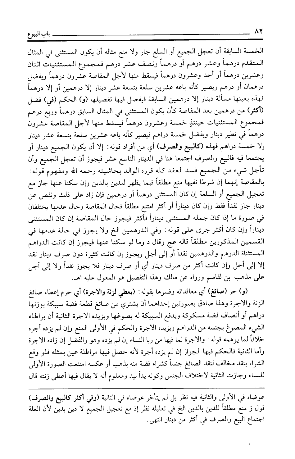 الخمسة السابقة أن تعجل الجميع أو السلع جار ولا منع مثاله أن يكون المستثنى في المثال المتقدم درهمًا وعشر درهم أو درهمًا ونصف عشر درهم فمجموع المستثنيات اثنان وعشرين درهمًا أو أحد وعشرون درهمًا فيسقط منها لأجل المقاصة عشرون درهمًا ويفضل درهمان أو درهم ويصير كأنه باعه عشرين سلعة بتسعة عشر دينار إلا درهمين أو إلا درهمًا فهذه بعينها مسألة دينار إلا درهمين السابقة فيفصل فيها تفصيلها (و) الحكم (في) فضل (أكثر) من درهمين بعد المقاصة كأن يكون المستثنى في المثال السابق درهمًا وربع درهم فمجموع المستثنيات حينئذ خمسة وعشرون درهمًا فيسقط منها لأجل المقاصة عشرون درهمًا في نظير دينار ويفضل خمسة دراهم فيصير كأنه باعه عشرين سلعة بتسعة عشر دينار إلا خمسة دراهم فهذه (كالبيع والصرف) أي من أفراد قوله: إلا أن يكون الجميع دينار أو يجتمعا فيه فالبيع والصرف اجتمعا هنا في الدينار التاسع عشر فيجوز أن تعجل الجميع وأن تأجل شيء من الجميع فسد العقد كله قرره الوالد بحاشيته رحمه الله ومفهوم قوله: بالمقاصة إنهما إن شرطا نفيها منع مطلقًا فيما يظهر للدين بالدين وإن سكتا عنها جاز مع تعجيل الجميع أو السلعة إن كان المستثنى درهمًا أو درهمين فإن زاد على ذلك ونقص عن دينار جاز نقدًا فقط وإن كان دينارًا أو أكثر امتنع مطلقًا فحال المقاصة وحال عدمها يختلفان في صورة ما إذا كان جمله المستثنى دينارًا فأكثر فيجوز حال المقاصة إن كان المستثنى دينارًا وإن كان أكثر جرى على قوله: وفي الدرهمين الخ ولا يجوز في حالة عدمها في القسمين المذكورين مطلقًا قاله عج وقال د وما لو سكنا عنها فيجوز إن كانت الدراهم المستثناة الدرهم والدرهمين نقدًا أو إلى أجل ويجوز إن كانت كثيرة دون صرف دينار نقد إلا إلى أجل وإن كانت أكثر من صرف دينار أي أو صرف دينار فلا يجوز نقدًا ولا إلى أجل على مذهب ابن القاسم ورواه عن مالك وهذا التفصيل هو المعول عليه اهـ.