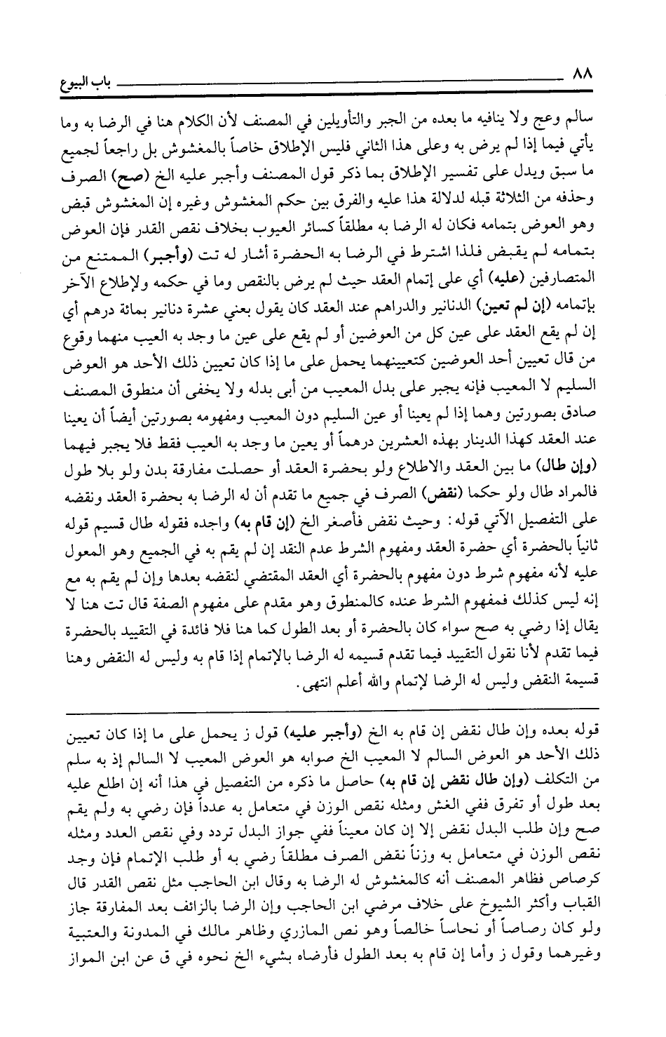 سالم وعج ولا ينافيه ما بعده من الجبر والتأويلين في المصنف لأن الكلام هنا في الرضا به وما يأتي فيما إذا لم يرض به وعلى هذا الثاني فليس الإطلاق خاصًّا بالمغشوش بل راجعًا لجميع ما سبق ويدل على تفسير الإطلاق بما ذكر قول المصنف وأجبر عليه الخ (صح) الصرف وحذفه من الثلاثة قبله لدلالة هذا عليه والفرق بين حكم المغشوش وغيره إن المغشوش قبض وهو العوض بتمامه فكان له الرضا به مطلقًا كسائر العيوب بخلاف نقص القدر فإن العوض بتمامه لم يقبض فلذا اشترط في الرضا به الحضرة أشار له تت (وأجبر) الممتنع من المتصارفين (عليه) أي على إتمام العقد حيث لم يرض بالنقص وما في حكمه ولإطلاع الآخر بإتمامه (إن لم تعين) الدنانير والدراهم عند العقد كان يقول بعني عشرة دنانير بمائة درهم أي إن لم يقع العقد على عين كل من العوضين أو لم يقع على عين ما وجد به العيب منهما وقوع من قال تعيين أحد العوضين كتعيينهما يحمل على ما إذا كان تعيين ذلك الأحد هو العوض السليم لا المعيب فإنه يجبر على بدل المعيب من أبى بدله ولا يخفى أن منطوق المصنف صادق بصورتين وهما إذا لم يعينا أو عين السليم دون المعيب ومفهومه بصورتين أيضًا أن يعينا عند العقد كهذا الدينار بهذه العشرين درهمًا أو يعين ما وجد به العيب فقط فلا يجبر فيهما (وإن طال) ما بين العقد والاطلاع ولو بحضرة العقد أو حصلت مفارقة بدن ولو بلا طول فالمراد طال ولو حكما (نقض) الصرف في جميع ما تقدم أن له الرضا به بحضرة العقد ونقضه على التفصيل الآتي قوله: وحيث نقض فأصغر الخ (إن قام به) واجده فقوله طال قسيم قوله ثانيًا بالحضرة أي حضرة العقد ومفهوم الشرط عدم النقد إن لم يقم به في الجميع وهو المعول عليه لأنه مفهوم شرط دون مفهوم بالحضرة أي العقد المقتضي لنقضه بعدها وإن لم يقم به مع إنه ليس كذلك فمفهوم الشرط عنده كالمنطوق وهو مقدم على مفهوم الصفة قال تت هنا لا يقال إذا رضي به صح سواء كان بالحضرة أو بعد الطول كما هنا فلا فائدة في التقييد بالحضرة فيما تقدم لأنا نقول التقييد فيما تقدم قسيمه له الرضا بالإتمام إذا قام به وليس له النقض وهنا قسيمة النقض وليس له الرضا لإتمام والله أعلم انتهى.