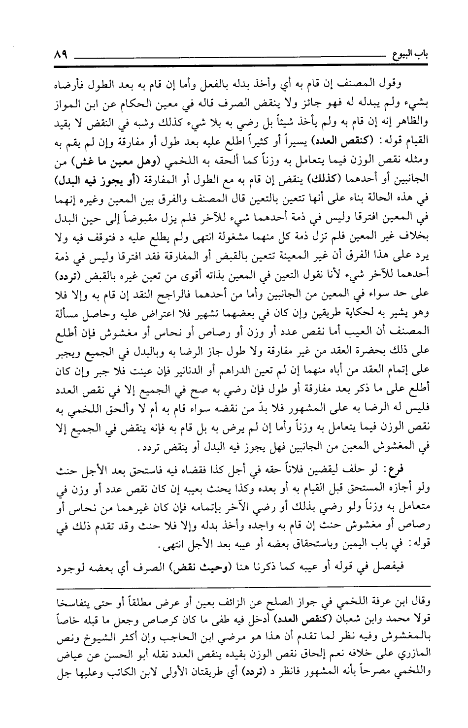 وقال ابن عرفة اللخمي في جواز الصلح عن الزائف بعين أو عرض مطلقًا أو حتى يتفاسخا قولا محمَّد وابن شعبان (كنقص العدد) أدخل فيه طفى ما كان كرصاص وجعل ما قبله خاصًّا بالمغشوش وفيه نظر لما تقدم أن هذا هو مرضي ابن الحاجب وإن أكثر الشيوخ ونص المازري على خلافه نعم إلحاق نقص الوزن بقيده ينقص العدد نقله أبو الحسن عن عياض واللخمي مصرحًا بأنه المشهور فانظر د (تردد) أي طريقتان الأولى لابن الكاتب وعليها جل