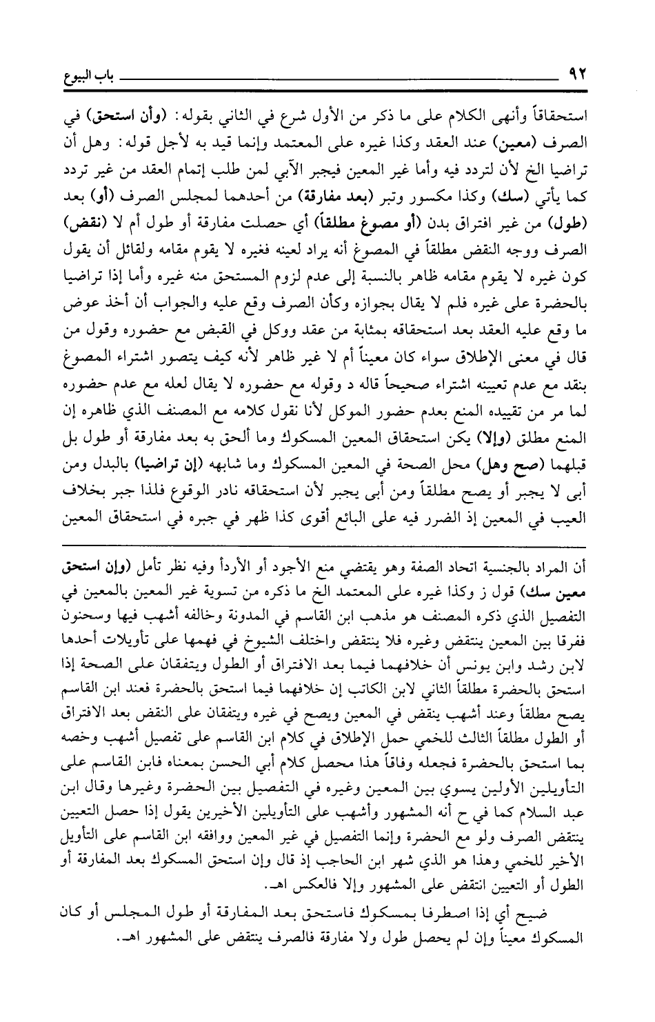 أن المراد بالجنسية اتحاد الصفة وهو يقتضي منع الأجود أو الأردأ وفيه نظر تأمل (وإن استحق معين سك) قول ز وكذا غيره على المعتمد الخ ما ذكره من تسوية غير المعين بالمعين في التفصيل الذي ذكره المصنف هو مذهب ابن القاسم في المدونة وخالفه أشهب فيها وسحنون ففرقا بين المعين ينتقض وغيره فلا ينتقض واختلف الشيوخ في فهمها على تأويلات أحدها لابن رشد وابن يونس أن خلافهما فيما بعد الافتراق أو الطول ويتفقان على الصحة إذا استحق بالحضرة مطلقًا الثاني لابن الكاتب إن خلافهما فيما استحق بالحضرة فعند ابن القاسم يصح مطلقًا وعند أشهب ينقض في المعين ويصح في غيره ويتفقان على النقض بعد الافتراق أو الطول مطلقًا الثالث للخمي حمل الإطلاق في كلام ابن القاسم على تفصيل أشهب وخصه بما استحق بالحضرة فجعله وفاقًا هذا محصل كلام أبي الحسن بمعناه فابن القاسم على التأويلين الأولين يسوي بين المعين وغيره في التفصيل بين الحضرة وغيرها وقال ابن عبد السلام كما في ح أنه المشهور وأشهب على التأويلين الأخيرين يقول إذا حصل التعيين ينتقض الصرف ولو مع الحضرة وإنما التفصيل في غير المعين ووافقه ابن القاسم على التأويل الأخير للخمي وهذا هو الذي شهر ابن الحاجب إذ قال وإن استحق المسكوك بعد المفارقة أو الطول أو التعيين انتقض على المشهور وإلا فالعكس اهـ.