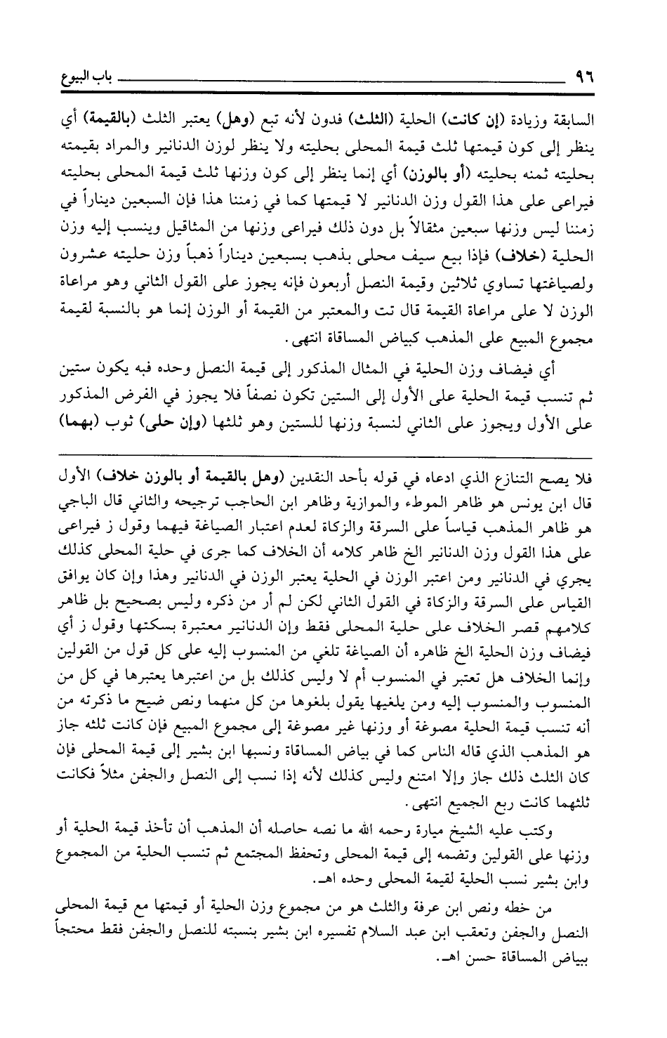 من خطه ونص ابن عرفة والثلث هو من مجموع وزن الحلية أو قيمتها مع قيمة المحلى النصل والجفن وتعقب ابن عبد السلام تفسيره ابن بشير بنسبته للنصل والجفن فقط محتجًا ببياض المساقاة حسن اهـ.