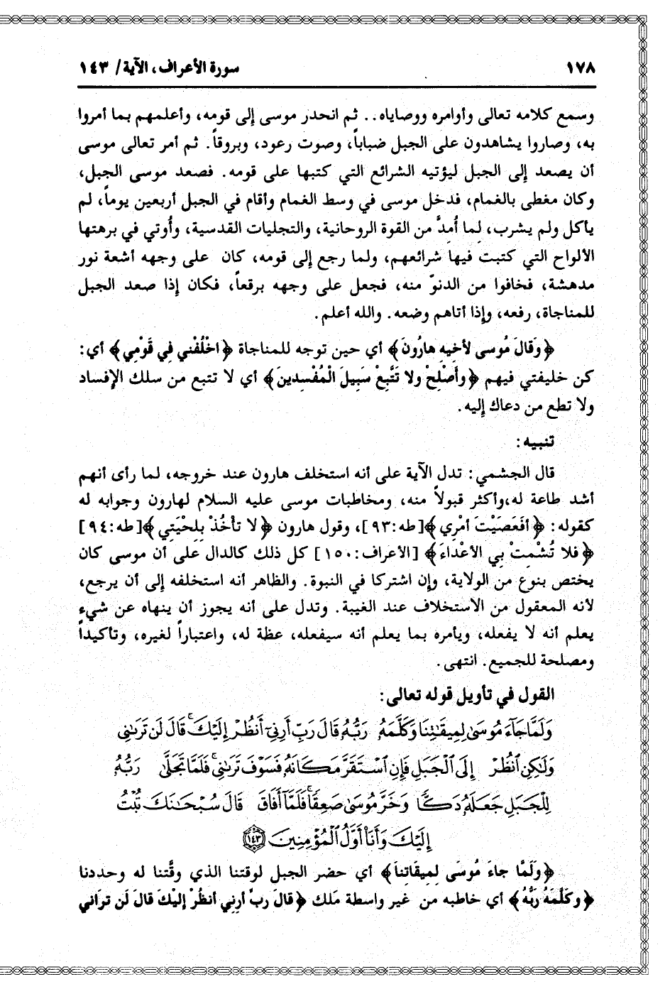وَلَمَّا جاءَ مُوسى لِمِيقاتِنا وَكَلَّمَهُ رَبُّهُ قالَ رَبِّ أَرِنِي أَنْظُرْ إِلَيْكَ قالَ لَنْ تَرانِي وَلكِنِ انْظُرْ إِلَى الْجَبَلِ فَإِنِ اسْتَقَرَّ مَكانَهُ فَسَوْفَ تَرانِي فَلَمَّا تَجَلَّى رَبُّهُ لِلْجَبَلِ جَعَلَهُ دَكًّا وَخَرَّ مُوسى صَعِقاً فَلَمَّا أَفاقَ قالَ سُبْحانَكَ تُبْتُ إِلَيْكَ وَأَنَا أَوَّلُ الْمُؤْمِنِينَ (143)