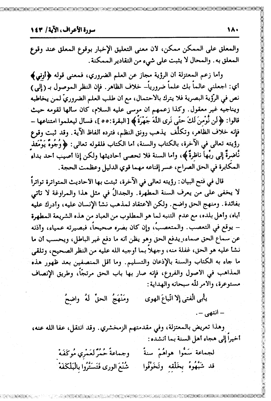 وهذا تعريض بالمعتزلة، وفي مقدمتهم الزمخشري. وقد انتقل، عفا الله عنه، أخيرا إلى هجاء أهل السنة بما أنشده: