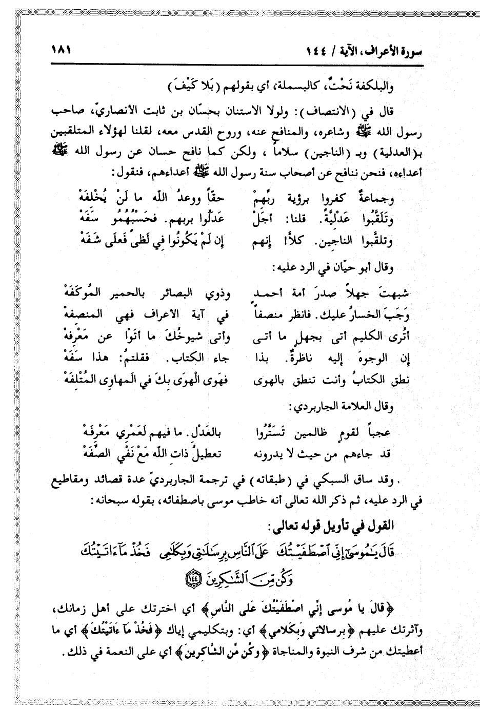 وقد ساق السبكي في (طبقاته) في ترجمة الجاربرديّ عدة قصائد ومقاطيع في الرد عليه، ثم ذكر الله تعالى أنه خاطب موسى باصطفائه، بقوله سبحانه: