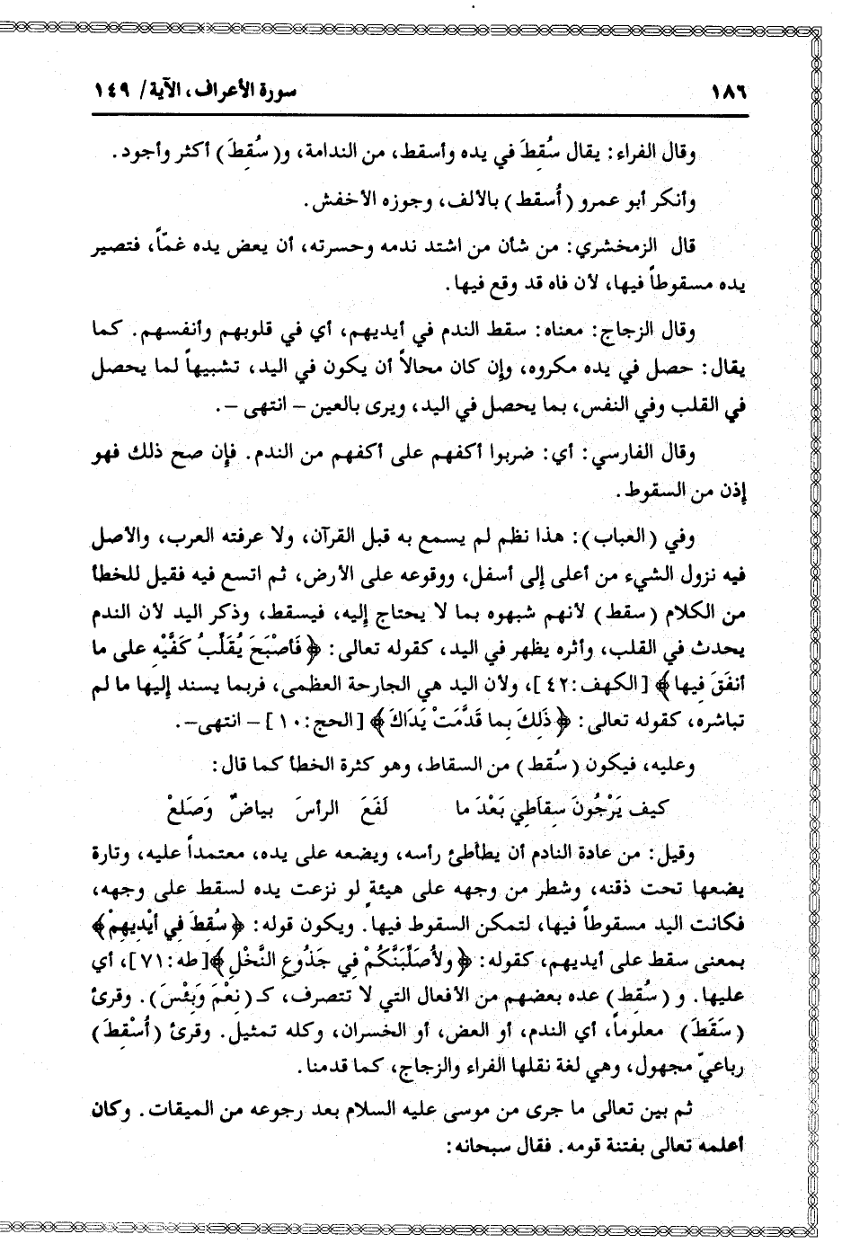 وفي (العباب) : هذا نظم لم يسمع به قبل القرآن، ولا عرفته العرب، والأصل فيه نزول الشيء من أعلى إلى أسفل، ووقوعه على الأرض، ثم اتسع فيه فقيل للخطأ من الكلام (سقط) لأنهم شبهوه بما لا يحتاج إليه، فيسقط، وذكر اليد لأن الندم يحدث في القلب، وأثره يظهر في اليد، كقوله تعالى: فَأَصْبَحَ يُقَلِّبُ كَفَّيْهِ عَلى ما أَنْفَقَ فِيها [الكهف: 42] ، ولأن اليد هي الجارحة العظمى، فربما يسند إليها ما لم تباشره، كقوله تعالى: ذلِكَ بِما قَدَّمَتْ يَداكَ [الحج: 10]- انتهى-.