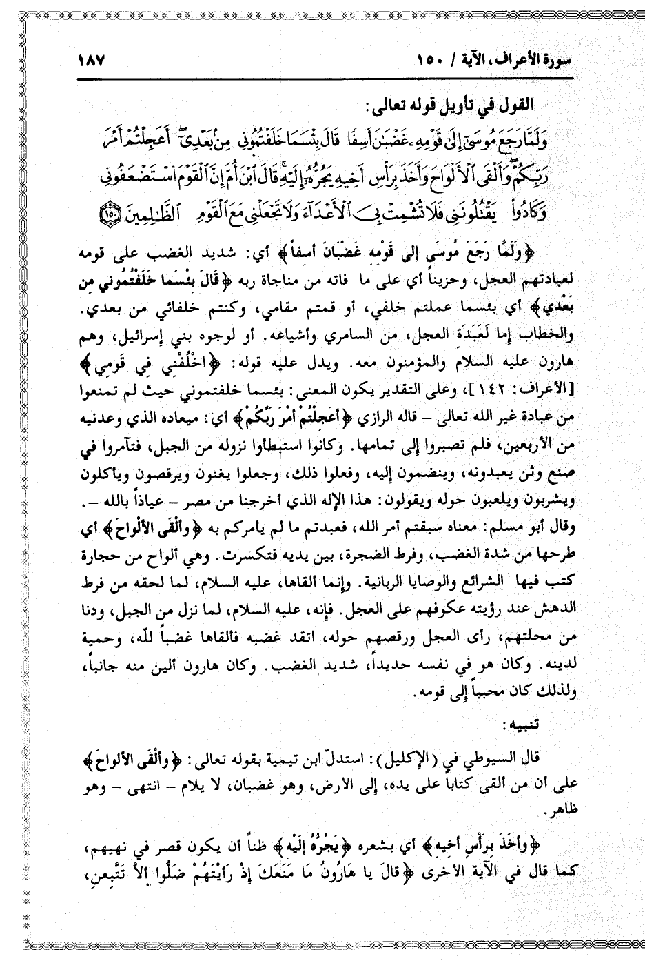 وَلَمَّا رَجَعَ مُوسى إِلى قَوْمِهِ غَضْبانَ أَسِفاً قالَ بِئْسَما خَلَفْتُمُونِي مِنْ بَعْدِي أَعَجِلْتُمْ أَمْرَ رَبِّكُمْ وَأَلْقَى الْأَلْواحَ وَأَخَذَ بِرَأْسِ أَخِيهِ يَجُرُّهُ إِلَيْهِ قالَ ابْنَ أُمَّ إِنَّ الْقَوْمَ اسْتَضْعَفُونِي وَكادُوا يَقْتُلُونَنِي فَلا تُشْمِتْ بِيَ الْأَعْداءَ وَلا تَجْعَلْنِي مَعَ الْقَوْمِ الظَّالِمِينَ (150)