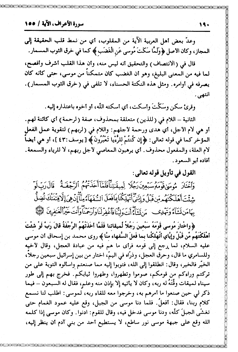 وَاخْتارَ مُوسى قَوْمَهُ سَبْعِينَ رَجُلاً لِمِيقاتِنا فَلَمَّا أَخَذَتْهُمُ الرَّجْفَةُ قالَ رَبِّ لَوْ شِئْتَ أَهْلَكْتَهُمْ مِنْ قَبْلُ وَإِيَّايَ أَتُهْلِكُنا بِما فَعَلَ السُّفَهاءُ مِنَّا إِنْ هِيَ إِلاَّ فِتْنَتُكَ تُضِلُّ بِها مَنْ تَشاءُ وَتَهْدِي مَنْ تَشاءُ أَنْتَ وَلِيُّنا فَاغْفِرْ لَنا وَارْحَمْنا وَأَنْتَ خَيْرُ الْغافِرِينَ (155)
