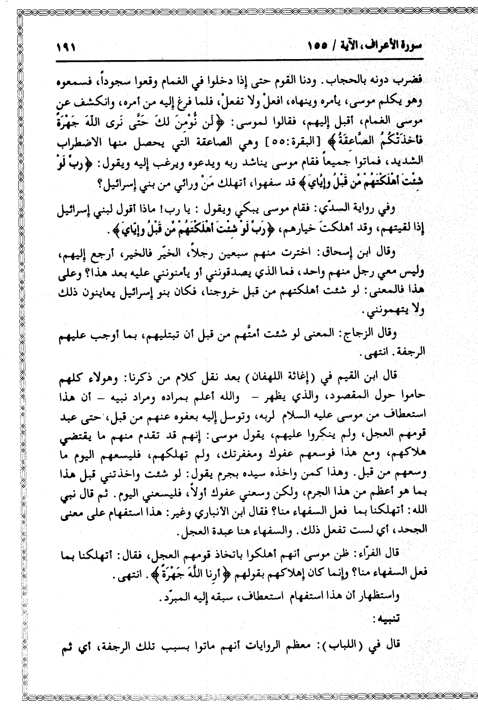 قال ابن القيم في (إغاثة اللهفان) بعد نقل كلام من ذكرنا: وهؤلاء كلهم حاموا حول المقصود، والذي يظهر- والله أعلم بمراده ومراد نبيه- أن هذا استعطاف من موسى عليه السلام لربه، وتوسل إليه بعفوه عنهم من قبل، حتى عبد قومهم العجل، ولم ينكروا عليهم، يقول موسى: إنهم قد تقدم منهم ما يقتضي هلاكهم، ومع هذا فوسعهم عفوك ومغفرتك، ولم تهلكهم، فليسعهم اليوم ما وسعهم من قبل. وهذا كمن واخذه سيده بجرم يقول: لو شئت واخذتني قبل هذا بما هو أعظم من هذا الجرم، ولكن وسعني عفوك أولا، فليسعني اليوم. ثم قال نبي الله: أتهلكنا بما فعل السفهاء منا؟ فقال ابن الأنباري وغير: هذا استفهام على معنى الجحد، أي لست تفعل ذلك. والسفهاء هنا عبدة العجل.