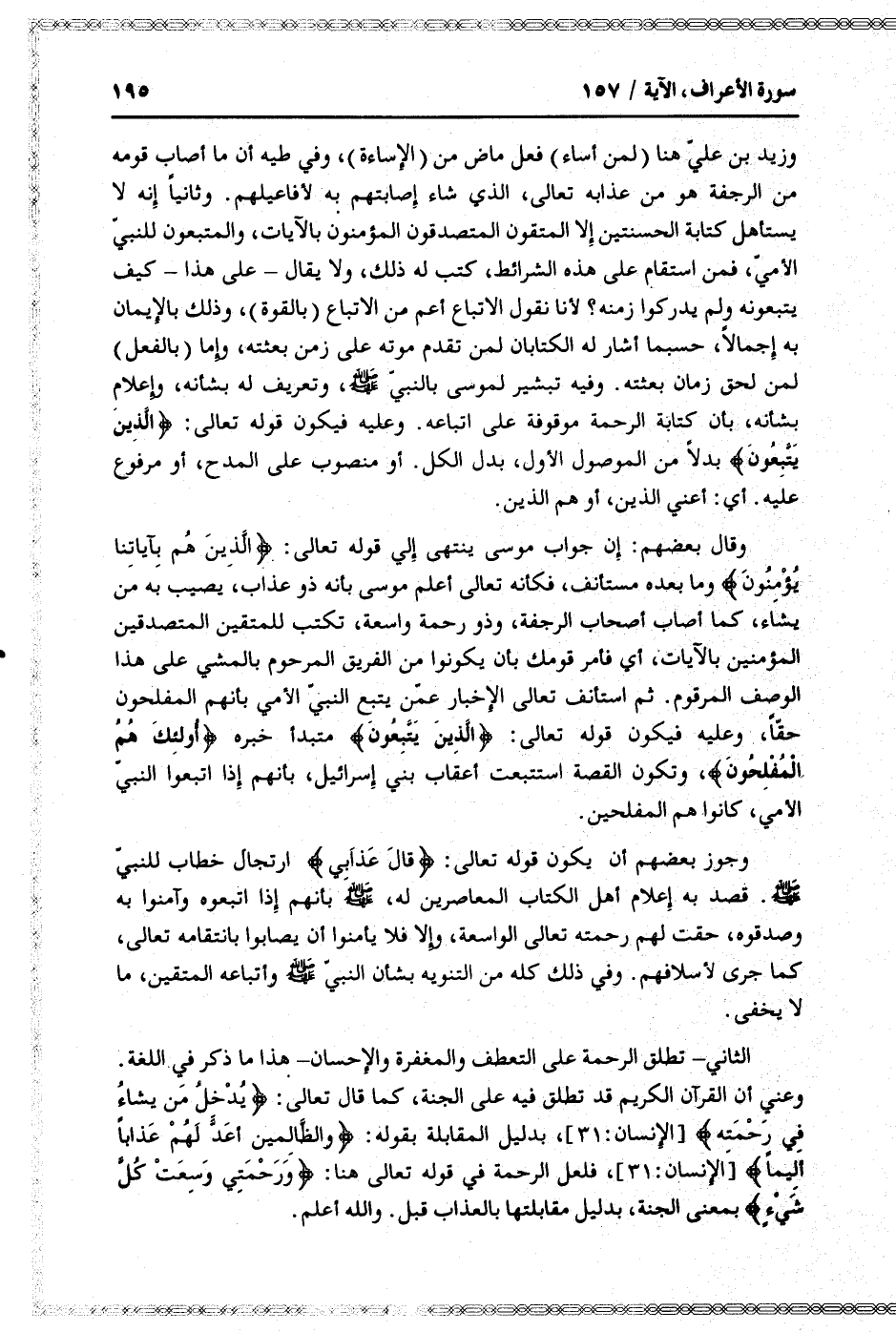 وقال بعضهم: إن جواب موسى ينتهى إلي قوله تعالى: الَّذِينَ هُمْ بِآياتِنا يُؤْمِنُونَ وما بعده مستأنف، فكأنه تعالى أعلم موسى بأنه ذو عذاب، يصيب به من يشاء، كما أصاب أصحاب الرجفة، وذو رحمة واسعة، تكتب للمتقين المتصدقين المؤمنين بالآيات، أي فأمر قومك بأن يكونوا من الفريق المرحوم بالمشي على هذا الوصف المرقوم. ثم استأنف تعالى الإخبار عمّن يتبع النبيّ الأمي بأنهم المفلحون حقّا، وعليه فيكون قوله تعالى: الَّذِينَ يَتَّبِعُونَ مبتدأ خبره أُولئِكَ هُمُ الْمُفْلِحُونَ، وتكون القصة استتبعت أعقاب بني إسرائيل، بأنهم إذا اتبعوا النبيّ الأمي، كانوا هم المفلحين.