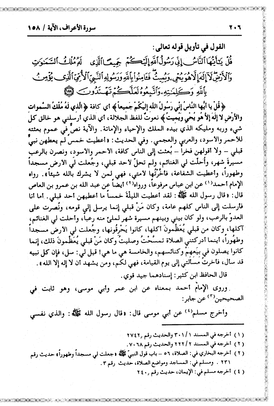 قُلْ يا أَيُّهَا النَّاسُ إِنِّي رَسُولُ اللَّهِ إِلَيْكُمْ جَمِيعاً الَّذِي لَهُ مُلْكُ السَّماواتِ وَالْأَرْضِ لا إِلهَ إِلاَّ هُوَ يُحيِي وَيُمِيتُ فَآمِنُوا بِاللَّهِ وَرَسُولِهِ النَّبِيِّ الْأُمِّيِّ الَّذِي يُؤْمِنُ بِاللَّهِ وَكَلِماتِهِ وَاتَّبِعُوهُ لَعَلَّكُمْ تَهْتَدُونَ (158)