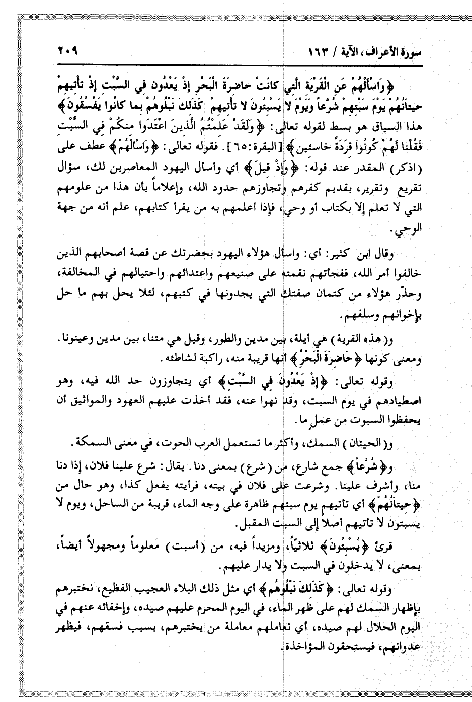 وَسْئَلْهُمْ عَنِ الْقَرْيَةِ الَّتِي كانَتْ حاضِرَةَ الْبَحْرِ إِذْ يَعْدُونَ فِي السَّبْتِ إِذْ تَأْتِيهِمْ حِيتانُهُمْ يَوْمَ سَبْتِهِمْ شُرَّعاً وَيَوْمَ لا يَسْبِتُونَ لا تَأْتِيهِمْ كَذلِكَ نَبْلُوهُمْ بِما كانُوا يَفْسُقُونَ هذا السياق هو بسط لقوله تعالى: وَلَقَدْ عَلِمْتُمُ الَّذِينَ اعْتَدَوْا مِنْكُمْ فِي السَّبْتِ فَقُلْنا لَهُمْ كُونُوا قِرَدَةً خاسِئِينَ [البقرة: 65] . فقوله تعالى: وَسْئَلْهُمْ عطف على (اذكر) المقدر عند قوله: وَإِذْ قِيلَ أي وأسأل اليهود المعاصرين لك، سؤال تقريع وتقرير، بقديم كفرهم وتجاوزهم حدود الله، وإعلاما بأن هذا من علومهم التي لا تعلم إلا بكتاب أو وحي، فإذا أعلمهم به من يقرأ كتابهم، علم أنه من جهة الوحي.