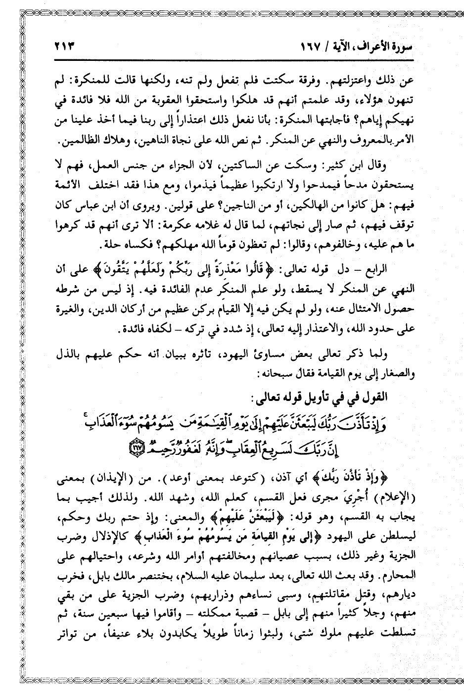وَإِذْ تَأَذَّنَ رَبُّكَ لَيَبْعَثَنَّ عَلَيْهِمْ إِلى يَوْمِ الْقِيامَةِ مَنْ يَسُومُهُمْ سُوءَ الْعَذابِ إِنَّ رَبَّكَ لَسَرِيعُ الْعِقابِ وَإِنَّهُ لَغَفُورٌ رَحِيمٌ (167)