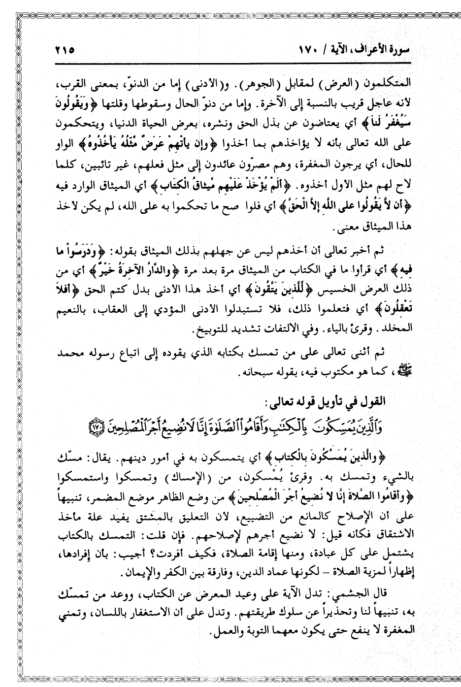 وَالَّذِينَ يُمَسِّكُونَ بِالْكِتابِ وَأَقامُوا الصَّلاةَ إِنَّا لا نُضِيعُ أَجْرَ الْمُصْلِحِينَ (170)