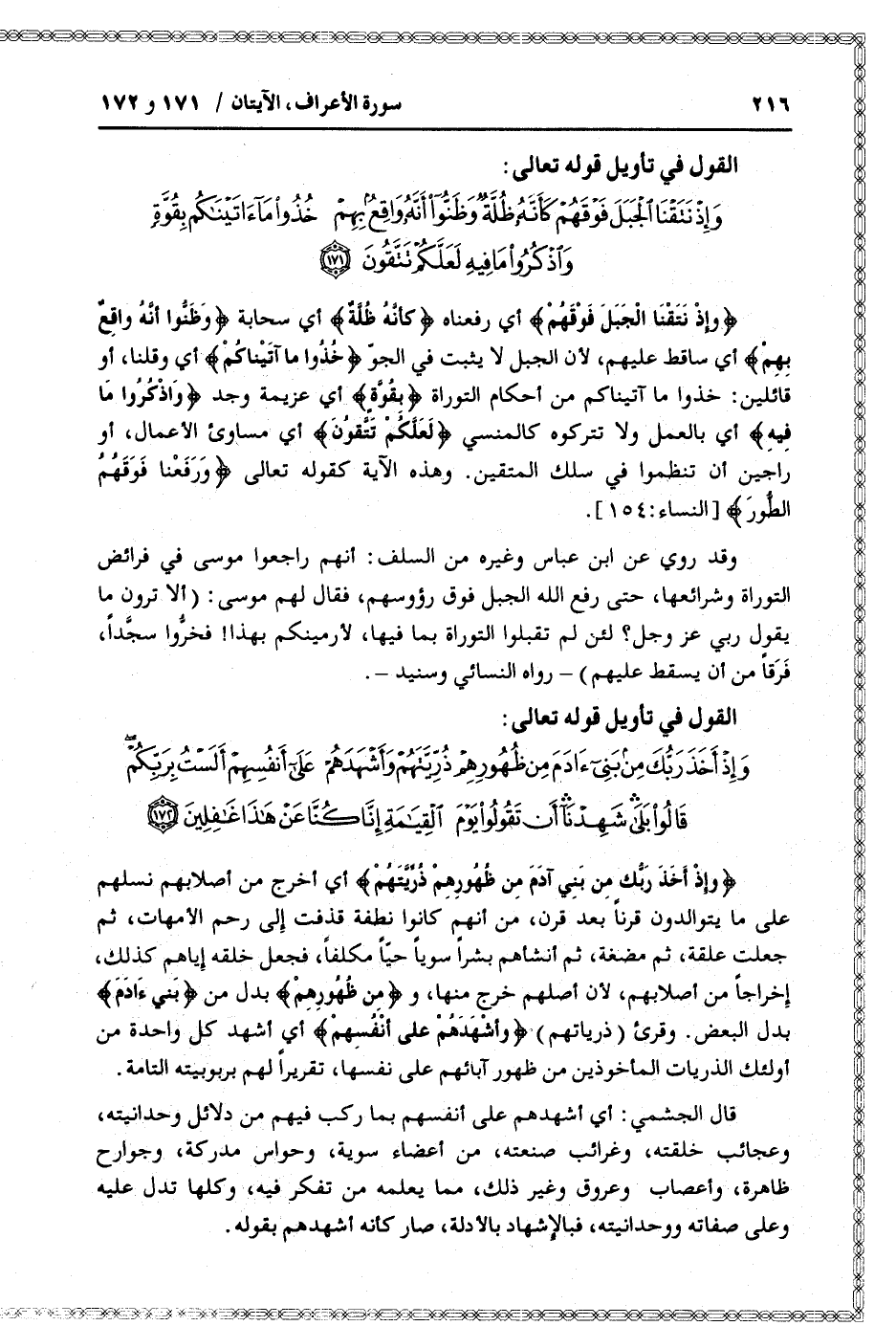 وَإِذْ أَخَذَ رَبُّكَ مِنْ بَنِي آدَمَ مِنْ ظُهُورِهِمْ ذُرِّيَّتَهُمْ وَأَشْهَدَهُمْ عَلى أَنْفُسِهِمْ أَلَسْتُ بِرَبِّكُمْ قالُوا بَلى شَهِدْنا أَنْ تَقُولُوا يَوْمَ الْقِيامَةِ إِنَّا كُنَّا عَنْ هذا غافِلِينَ (172)