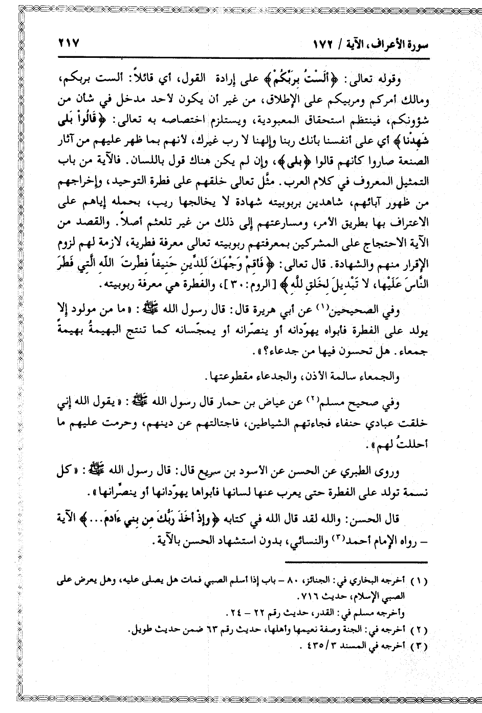 قال الحسن: والله لقد قال الله في كتابه وَإِذْ أَخَذَ رَبُّكَ مِنْ بَنِي آدَمَ ... الآية- رواه الإمام أحمد «3» والنسائي، بدون استشهاد الحسن بالآية.