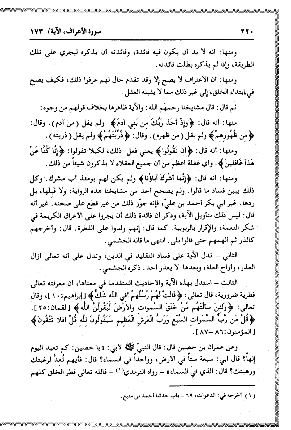 ومنها: أنه قال: إِنَّما أَشْرَكَ آباؤُنا ولم يكن لهم يومئذ أب مشرك. وكل ذلك يبين فساد ما قالوا. ولم يصحح أحد من مشايخنا هذه الرواية، ولا قبلها، بل ردها. غير أبي بكر أحمد بن عليّ، فإنه جوّز ذلك من غير قطع على صحته. غير أنه قال: ليس ذلك بتأويل الآية، وذكر أن فائدة ذلك أن يجروا على الأعراق الكريمة في شكر النعمة، والإقرار بالربوبية. كما قال: إنهم ولدوا على الفطرة. قال: وأخرجهم كالذر ثم الهمهم حتى قالوا بلى. انتهى ما قاله الجشمي.
