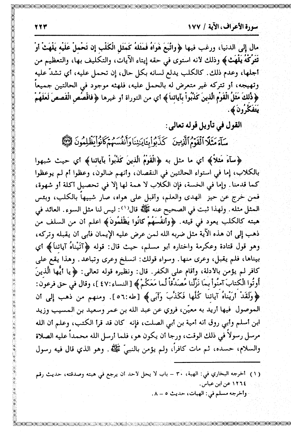 ساءَ مَثَلًا أي ما مثل به الْقَوْمُ الَّذِينَ كَذَّبُوا بِآياتِنا أي حيث شبهوا بالكلاب، إما في استواء الحالتين في النقصان، وأنهم ضالون، وعظوا أم لم يوعظوا كما قدمنا. وإما في الخسة، فإن الكلاب لا همة لها إلا في تحصيل أكلة أو شهوة، فمن خرج عن حيز الهدى والعلم، وأقبل على هواه، صار شبيها بالكلب، وبئس المثل مثله. ولهذا