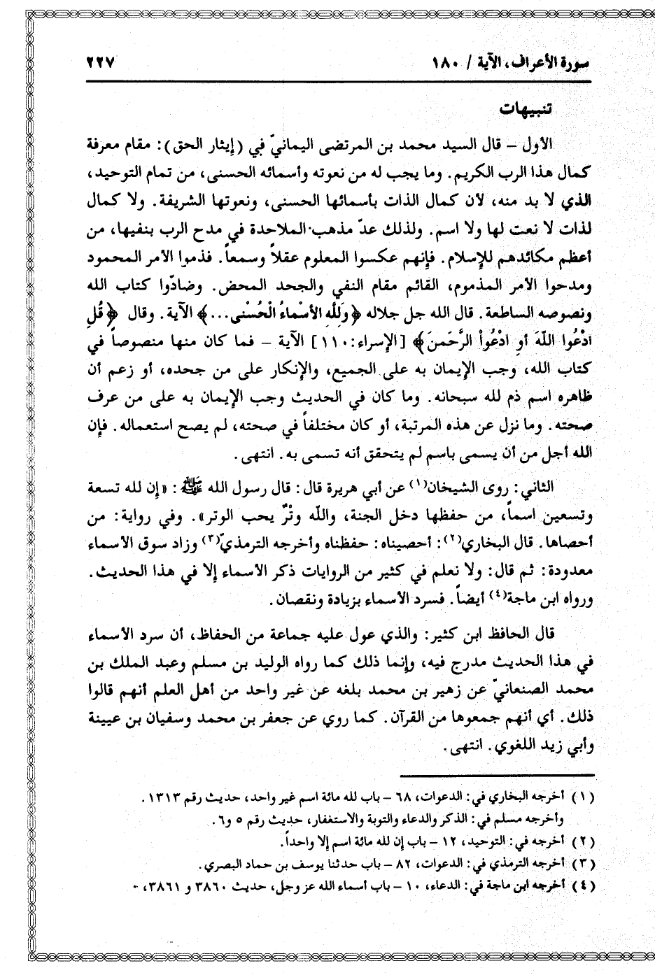 الأول- قال السيد محمد بن المرتضى اليمانيّ في (إيثار الحق) : مقام معرفة كمال هذا الرب الكريم. وما يجب له من نعوته وأسمائه الحسنى، من تمام التوحيد، الذي لا بد منه، لأن كمال الذات بأسمائها الحسنى، ونعوتها الشريفة. ولا كمال لذات لا نعت لها ولا اسم. ولذلك عدّ مذهب الملاحدة في مدح الرب بنفيها، من أعظم مكائدهم للإسلام. فإنهم عكسوا المعلوم عقلا وسمعا. فذموا الأمر المحمود ومدحوا الأمر المذموم، القائم مقام النفي والجحد المحض. وضادّوا كتاب الله ونصوصه الساطعة. قال الله جل جلاله وَلِلَّهِ الْأَسْماءُ الْحُسْنى ... الآية. وقال قُلِ ادْعُوا اللَّهَ أَوِ ادْعُوا الرَّحْمنَ [الإسراء: 110] الآية- فما كان منها منصوصا في كتاب الله، وجب الإيمان به على الجميع، والإنكار على من جحده، أو زعم أن ظاهره اسم ذم لله سبحانه. وما كان في الحديث وجب الإيمان به على من عرف صحته. وما نزل عن هذه المرتبة، أو كان مختلفا في صحته، لم يصح استعماله. فإن الله أجل من أن يسمى باسم لم يتحقق أنه تسمى به. انتهى.
