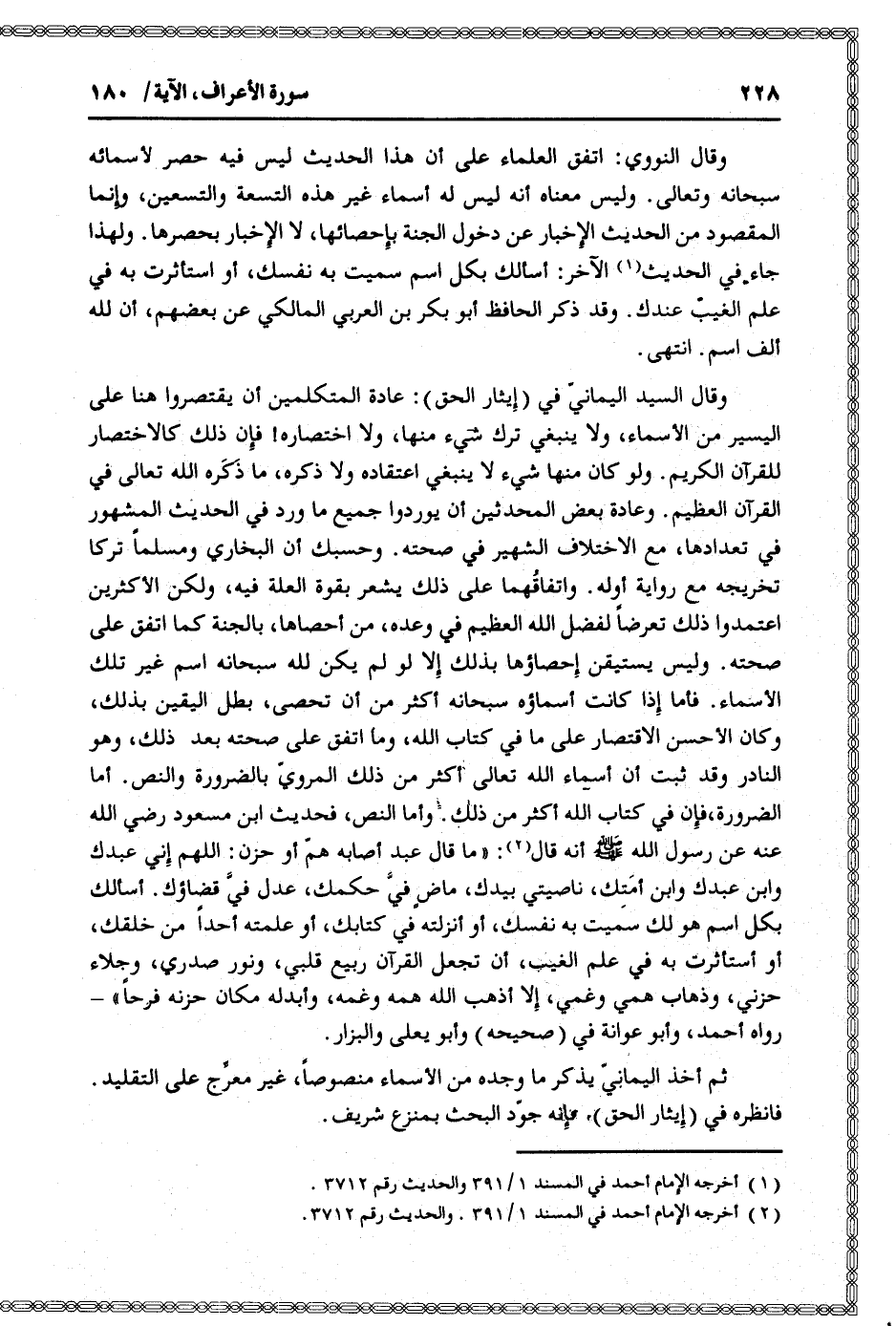 وقال السيد اليمانيّ في (إيثار الحق) : عادة المتكلمين أن يقتصروا هنا على اليسير من الأسماء، ولا ينبغي ترك شيء منها، ولا اختصاره! فإن ذلك كالاختصار للقرآن الكريم. ولو كان منها شيء لا ينبغي اعتقاده ولا ذكره، ما ذكره الله تعالى في القرآن العظيم. وعادة بعض المحدثين أن يوردوا جميع ما ورد في الحديث المشهور في تعدادها، مع الاختلاف الشهير في صحته. وحسبك أن البخاري ومسلما تركا تخريجه مع رواية أوله. واتفاقهما على ذلك يشعر بقوة العلة فيه، ولكن الأكثرين اعتمدوا ذلك تعرضا لفضل الله العظيم في وعده، من أحصاها، بالجنة كما اتفق على صحته. وليس يستيقن إحصاؤها بذلك إلا لو لم يكن لله سبحانه اسم غير تلك الأسماء. فأما إذا كانت أسماؤه سبحانه أكثر من أن تحصى، بطل اليقين بذلك، وكان الأحسن الاقتصار على ما في كتاب الله، وما اتفق على صحته بعد ذلك، وهو النادر وقد ثبت أن أسماء الله تعالى أكثر من ذلك المرويّ بالضرورة والنص. أما الضرورة، فإن في كتاب الله أكثر من ذلك. وأما النص،