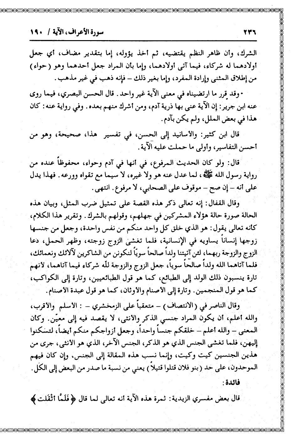 وقال الناصر في (الانتصاف) - متعقبا على الزمخشري-: الأسلم والأقرب، والله أعلم، أن يكون المراد جنسي الذكر والأنثى، لا يقصد فيه إلى معيّن. وكأن المعنى- والله أعلم- خلقكم جنسا واحدا، وجعل أزواجكم منكم أيضا، لتسكنوا إليهن، فلما تغشى الجنس الذي هو الذكر، الجنس الآخر، الذي هو الأنثى، جرى من هذين الجنسين كيت وكيت، وإنما نسب هذه المقالة إلى الجنس، وإن كان فيهم الموحدون، على حد (بنو فلان قتلوا قتيلا) يعني من نسبة ما صدر من البعض إلى الكل.
