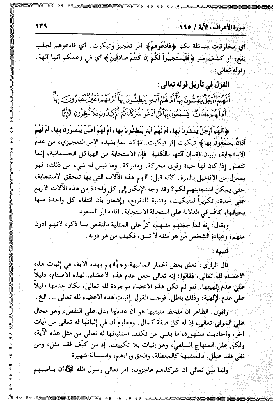 قال الرازي: تعلق بعض أغمار المشبهة وجهّالهم بهذه الآية، في إثبات هذه الأعضاء لله تعالى، فقالوا: إنه تعالى جعل عدم هذه الأعضاء، لهذه الأصنام، دليلا على عدم إلهيتها. فلو لم تكن هذه الأعضاء موجودة لله تعالى، لكان عدمها دليلا على عدم الإلهية، وذلك باطل. فوجب القول بإثبات هذه الأعضاء لله تعالى ... إلخ.