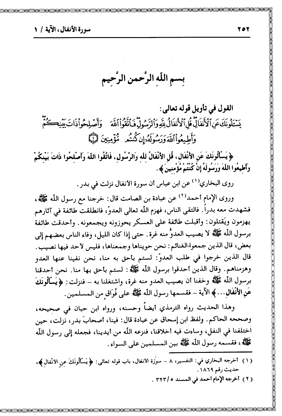 (1) أخرجه البخاري في: التفسير، 8- سورة الأنفال، باب قوله تعالى: يَسْئَلُونَكَ عَنِ الْأَنْفالِ، حديث رقم 1869.