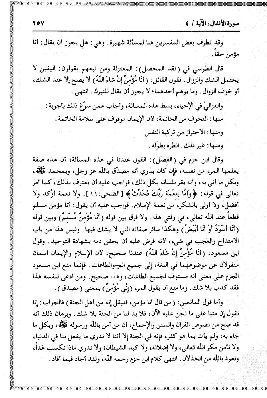 وقال ابن حزم في (الفصل) : القول عندنا في هذه المسألة أن هذه صفة يعلمها المرء من نفسه، فإن كان يدري أنه مصدّق بالله عز وجل، وبمحمد صلّى الله عليه وسلّم، وبكل ما أتى به، وأنه يقر بلسانه بكل ذلك، فواجب عليه أن يعترف بذلك، كما أمر تعالى في قوله: وَأَمَّا بِنِعْمَةِ رَبِّكَ فَحَدِّثْ [الضحى: 11] . ولا نعمة أوكد ولا أفضل، ولا أولى بالشكر، من نعمة الإسلام. فواجب عليه أن يقول: أنا مؤمن مسلم قطعا عند الله تعالى، في وقتي هذا. ولا فرق بين قوله (أنا مؤمن مسلم) وبين قوله (أنا أسود أو أنا أبيض) وهكذا سائر صفاته التي لا يشك فيها. وليس هذا من باب الامتداح والعجب في شيء، لأنه فرض عليه أن يحقن دمه بشهادة التوحيد. وقول ابن مسعود: (أنا مؤمن إن شاء الله) عندنا صحيح، لأن الإسلام والإيمان اسمان منقولان عن موضوعهما في اللغة، إلى جميع البر والطاعات. فإنما منع ابن مسعود الجزم على معنى أنه مستوف لجميع الطاعات، وهذا صحيح. ومن ادعى لنفسه هذا فقد كذب بلا شك. وما منع أن يقول المرء (إنّي مؤمن) بمعنى (مصدق) .