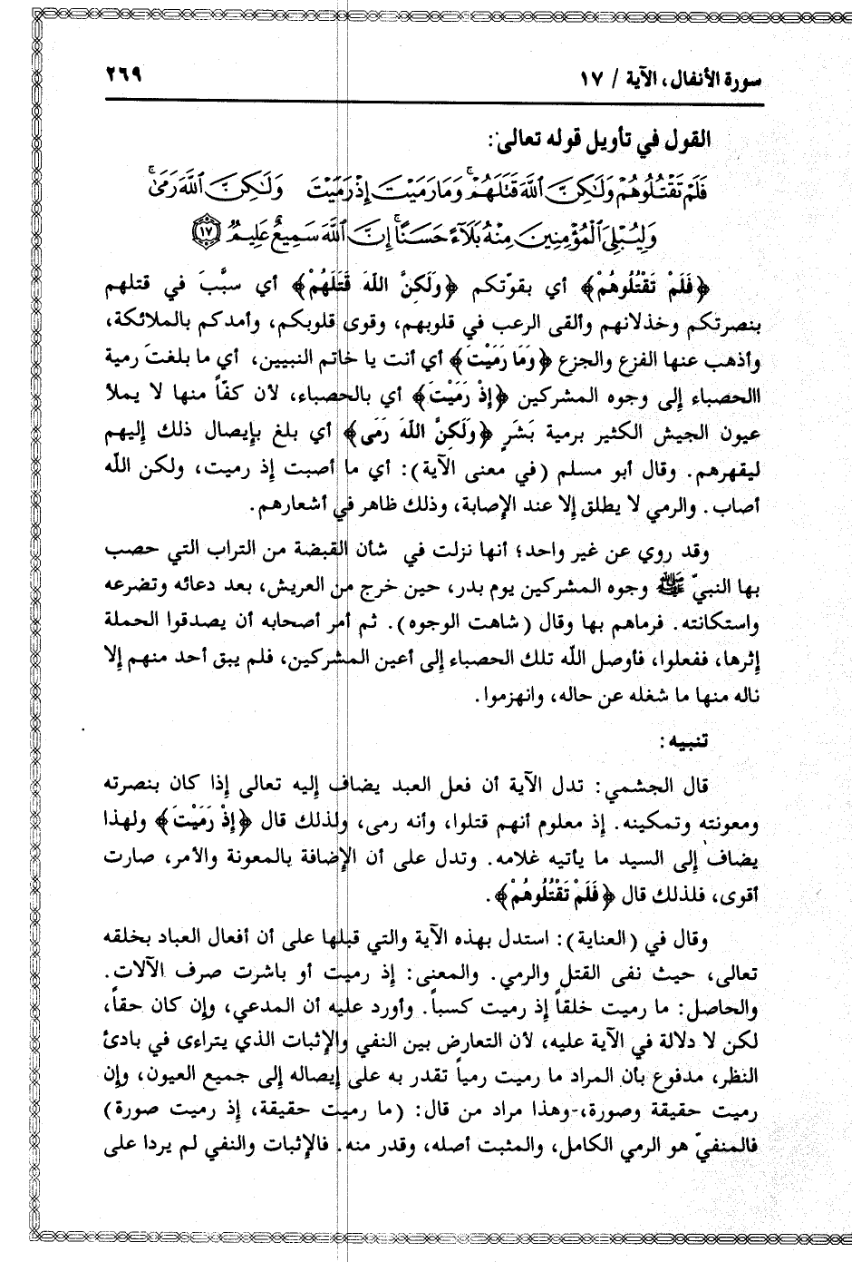 فَلَمْ تَقْتُلُوهُمْ وَلكِنَّ اللَّهَ قَتَلَهُمْ وَما رَمَيْتَ إِذْ رَمَيْتَ وَلكِنَّ اللَّهَ رَمى وَلِيُبْلِيَ الْمُؤْمِنِينَ مِنْهُ بَلاءً حَسَناً إِنَّ اللَّهَ سَمِيعٌ عَلِيمٌ (17)