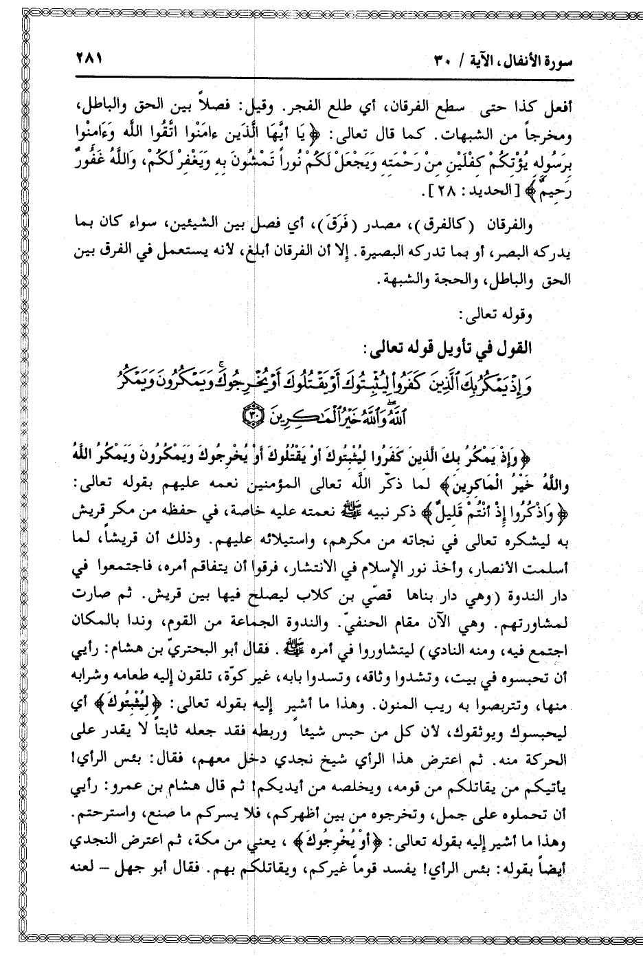 وَإِذْ يَمْكُرُ بِكَ الَّذِينَ كَفَرُوا لِيُثْبِتُوكَ أَوْ يَقْتُلُوكَ أَوْ يُخْرِجُوكَ وَيَمْكُرُونَ وَيَمْكُرُ اللَّهُ وَاللَّهُ خَيْرُ الْماكِرِينَ لما ذكّر الله تعالى المؤمنين نعمه عليهم بقوله تعالى: