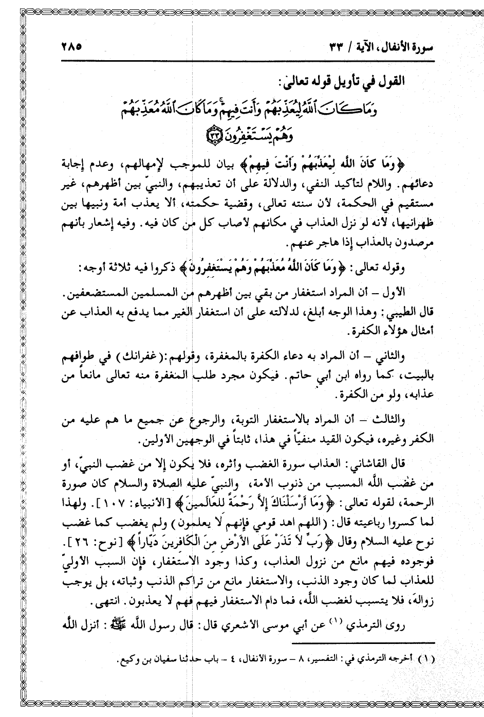 وَما كانَ اللَّهُ لِيُعَذِّبَهُمْ وَأَنْتَ فِيهِمْ وَما كانَ اللَّهُ مُعَذِّبَهُمْ وَهُمْ يَسْتَغْفِرُونَ (33)