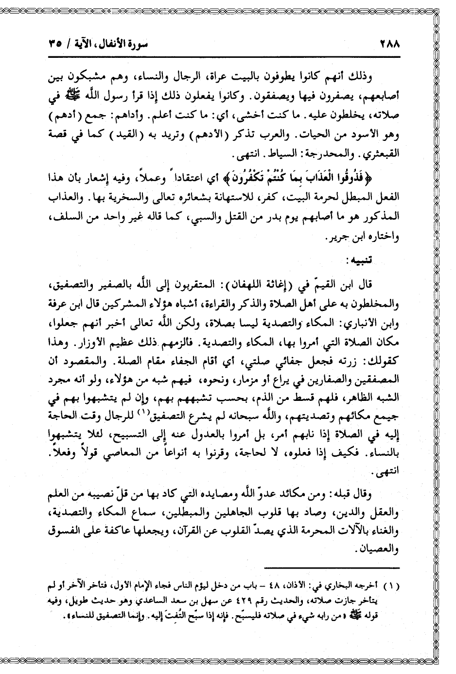قال ابن القيّم في (إغاثة اللهفان) : المتقربون إلى الله بالصفير والتصفيق، والمخلطون به على أهل الصلاة والذكر والقراءة، أشباه هؤلاء المشركين قال ابن عرفة وابن الأنباري: المكاء والتصدية ليسا بصلاة، ولكن الله تعالى أخبر أنهم جعلوا، مكان الصلاة التي أمروا بها، المكاء والتصدية. فألزمهم ذلك عظيم الأوزار. وهذا كقولك: زرته فجعل جفائي صلتي، أي أقام الجفاء مقام الصلة. والمقصود أن المصفقين والصفارين في يراع أو مزمار، ونحوه، فيهم شبه من هؤلاء، ولو أنه مجرد الشبه الظاهر، فلهم قسط من الذم، بحسب تشبههم بهم، وإن لم يتشبهوا بهم في جميع مكائهم وتصديتهم، والله سبحانه لم يشرع التصفيق «1» للرجال وقت الحاجة إليه في الصلاة إذا نابهم أمر، بل أمروا بالعدول عنه إلى التسبيح، لئلا يتشبهوا بالنساء. فكيف إذا فعلوه، لا لحاجة، وقرنوا به أنواعا من المعاصي قولا وفعلا.