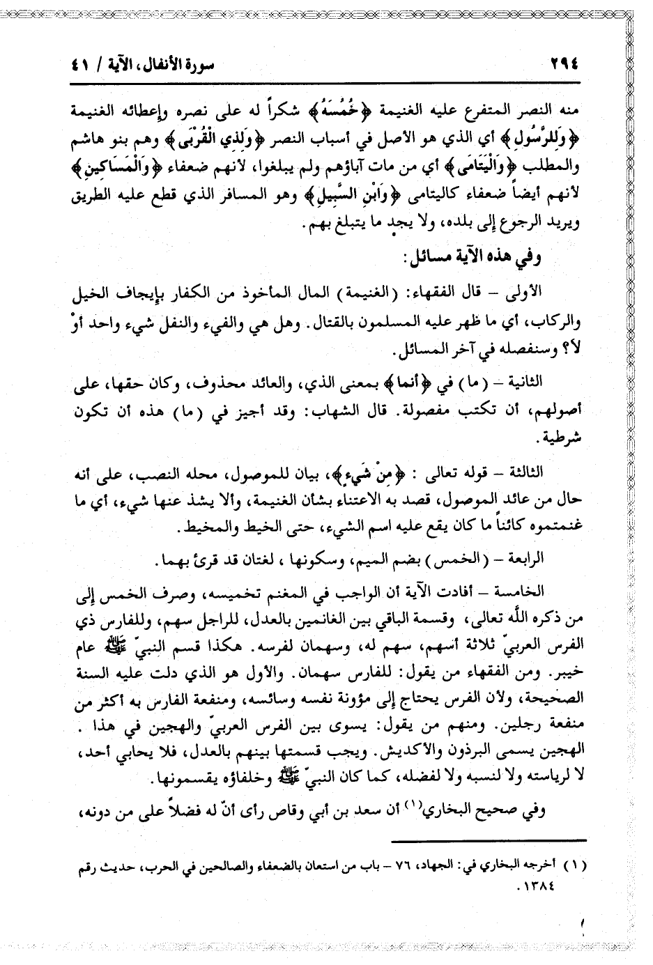 الخامسة- أفادت الآية أن الواجب في المغنم تخميسه، وصرف الخمس إلى من ذكره الله تعالى، وقسمة الباقي بين الغانمين بالعدل، للراجل سهم، وللفارس ذي الفرس العربيّ ثلاثة أسهم، سهم له، وسهمان لفرسه. هكذا قسم النبيّ صلّى الله عليه وسلّم عام خيبر. ومن الفقهاء من يقول: للفارس سهمان. والأول هو الذي دلت عليه السنة الصحيحة، ولأن الفرس يحتاج إلى مؤونة نفسه وسائسه، ومنفعة الفارس به أكثر من منفعة رجلين. ومنهم من يقول: يسوى بين الفرس العربيّ والهجين في هذا.