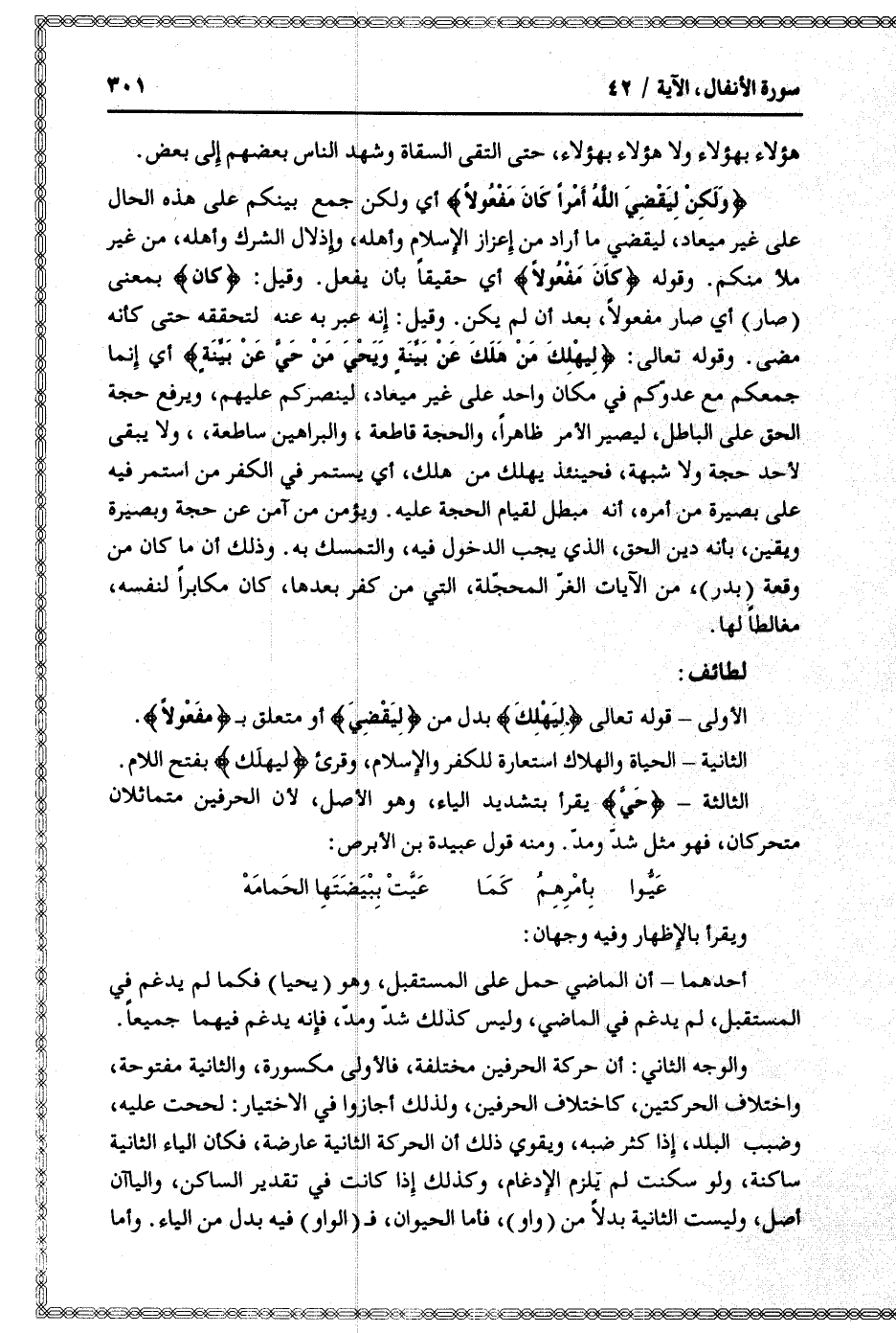 وَلكِنْ لِيَقْضِيَ اللَّهُ أَمْراً كانَ مَفْعُولًا أي ولكن جمع بينكم على هذه الحال على غير ميعاد، ليقضي ما أراد من إعزاز الإسلام وأهله، وإذلال الشرك وأهله، من غير ملأ منكم. وقوله كانَ مَفْعُولًا أي حقيقا بأن يفعل. وقيل: كانَ بمعنى (صار) أي صار مفعولا، بعد أن لم يكن. وقيل: إنه عبر به عنه لتحققه حتى كأنه مضى. وقوله تعالى: لِيَهْلِكَ مَنْ هَلَكَ عَنْ بَيِّنَةٍ وَيَحْيى مَنْ حَيَّ عَنْ بَيِّنَةٍ أي إنما جمعكم مع عدوّكم في مكان واحد على غير ميعاد، لينصركم عليهم، ويرفع حجة الحق على الباطل، ليصير الأمر ظاهرا، والحجة قاطعة، والبراهين ساطعة،، ولا يبقى لأحد حجة ولا شبهة، فحينئذ يهلك من هلك، أي يستمر في الكفر من استمر فيه على بصيرة من أمره، أنه مبطل لقيام الحجة عليه. ويؤمن من آمن عن حجة وبصيرة ويقين، بأنه دين الحق، الذي يجب الدخول فيه، والتمسك به. وذلك أن ما كان من وقعة (بدر) ، من الآيات الغرّ المحجّلة، التي من كفر بعدها، كان مكابرا لنفسه، مغالطا لها.