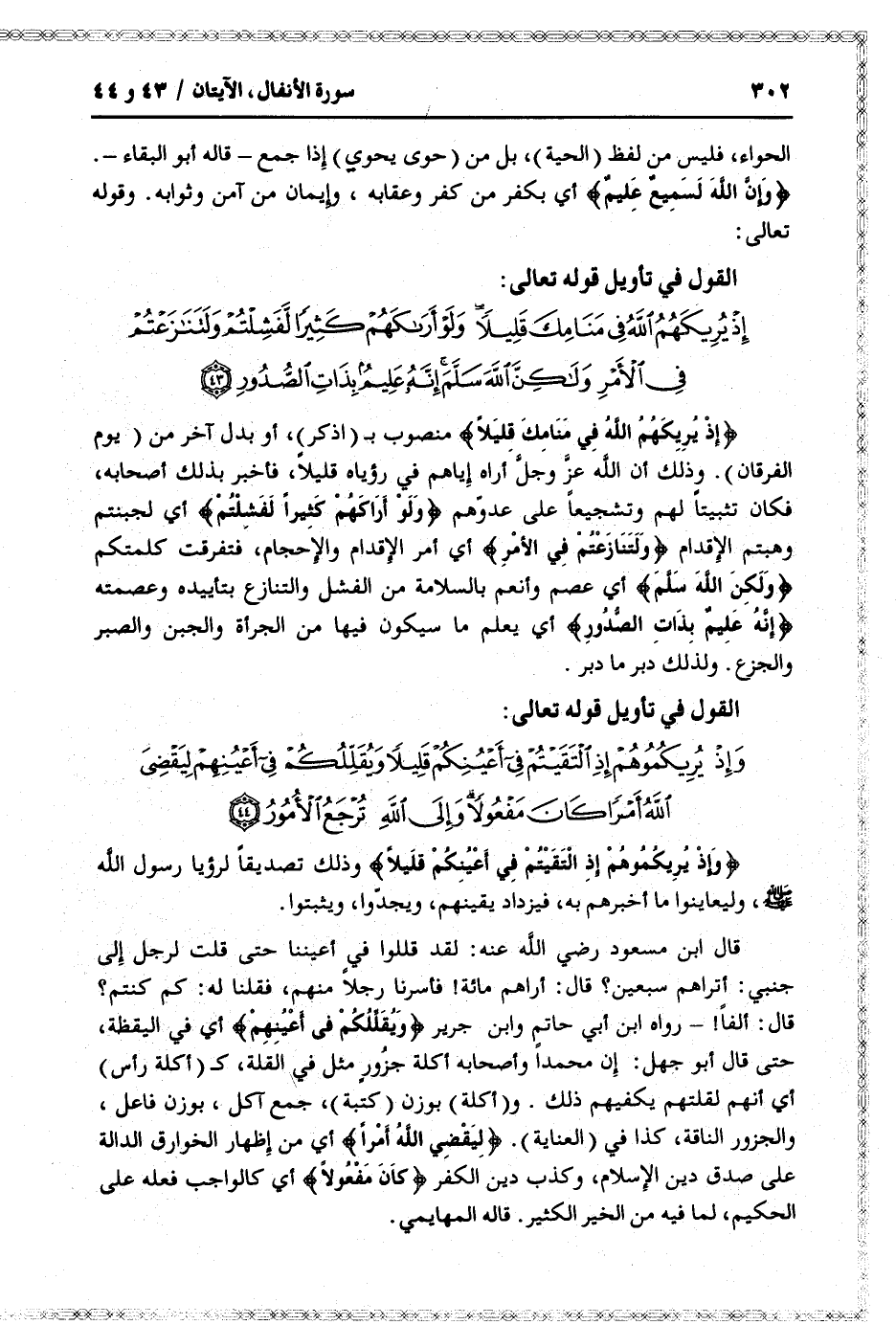 إِذْ يُرِيكَهُمُ اللَّهُ فِي مَنامِكَ قَلِيلاً وَلَوْ أَراكَهُمْ كَثِيراً لَفَشِلْتُمْ وَلَتَنازَعْتُمْ فِي الْأَمْرِ وَلكِنَّ اللَّهَ سَلَّمَ إِنَّهُ عَلِيمٌ بِذاتِ الصُّدُورِ (43)