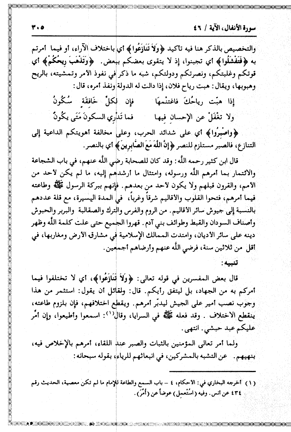 والتخصيص بالذكر هنا فيه تأكيد وَلا تَنازَعُوا أي باختلاف الآراء، أو فيما أمرتم به فَتَفْشَلُوا أي تجبنوا، إذ لا يتقوى بعضكم ببعض. وَتَذْهَبَ رِيحُكُمْ أي قوتكم وغلبتكم، ونصرتكم ودولتكم، شبه ما ذكر في نفوذ الأمر وتمشيته، بالريح وهبوبها، ويقال: هبت رياح فلان، إذا دالت له الدولة ونفذ أمره، قال: