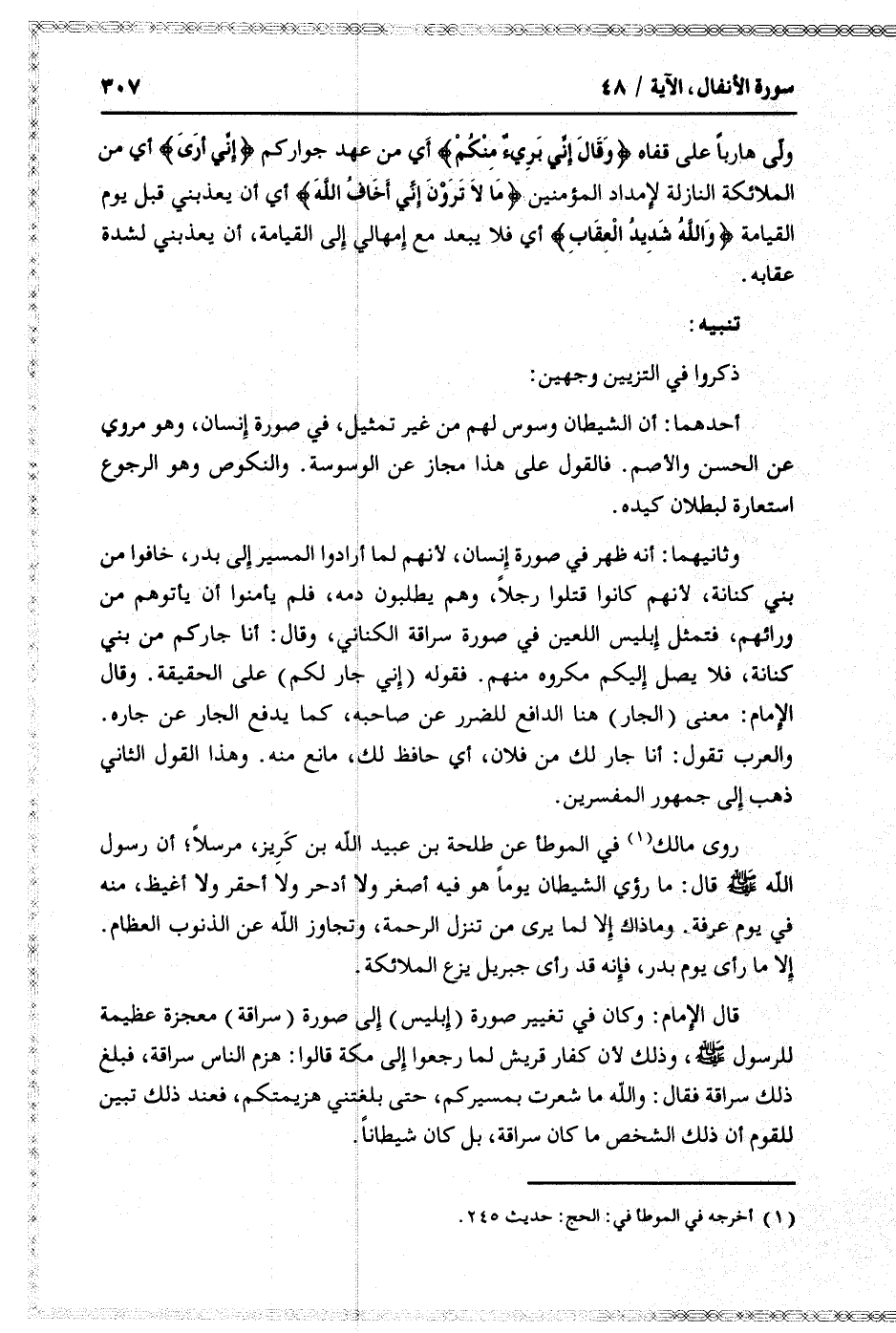 وثانيهما: أنه ظهر في صورة إنسان، لأنهم لما أرادوا المسير إلى بدر، خافوا من بني كنانة، لأنهم كانوا قتلوا رجلا، وهم يطلبون دمه، فلم يأمنوا أن يأتوهم من ورائهم، فتمثل إبليس اللعين في صورة سراقة الكناني، وقال: أنا جاركم من بني كنانة، فلا يصل إليكم مكروه منهم. فقوله (إني جار لكم) على الحقيقة. وقال الإمام: معنى (الجار) هنا الدافع للضرر عن صاحبه، كما يدفع الجار عن جاره.